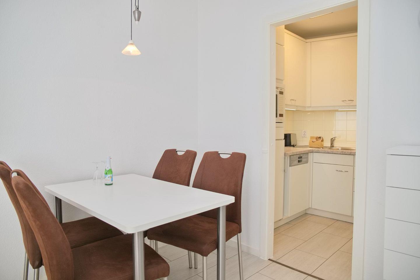Anliegend ist die offene Einbauküche, in der ein Backofen mit Mikrowelle mit Grillfunktion, ein Induktions-Kochfeld, ein Geschirrspüler, ein Kühlschrank mit Gefrierfach, eine Kaffeemaschine, ein Wasserkocher, ein Toaster und andere Kochutensilien die Ausstattung komplementieren. Im Schlafzimmer befinden sich ein komfortables Boxspringbett sowie ein Kleiderschrank mit viel Stauraum und einer Kommode. Weiteren Stauraum finden Sie in dem Schrank im Flur. Im Bad zu finden sind ein WC, ein Waschbecken, eine Perleffekt-Dusche sowie eine Waschmaschine.