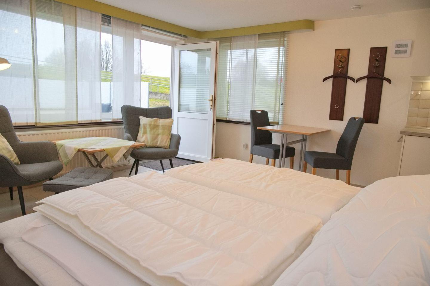 Gemütliche kleine Ferienwohnung mit möblierter Terrasse direkt hinter dem Deich in Zentrums naher Lage, nur ein Steinwurf vom Meer entfernt.