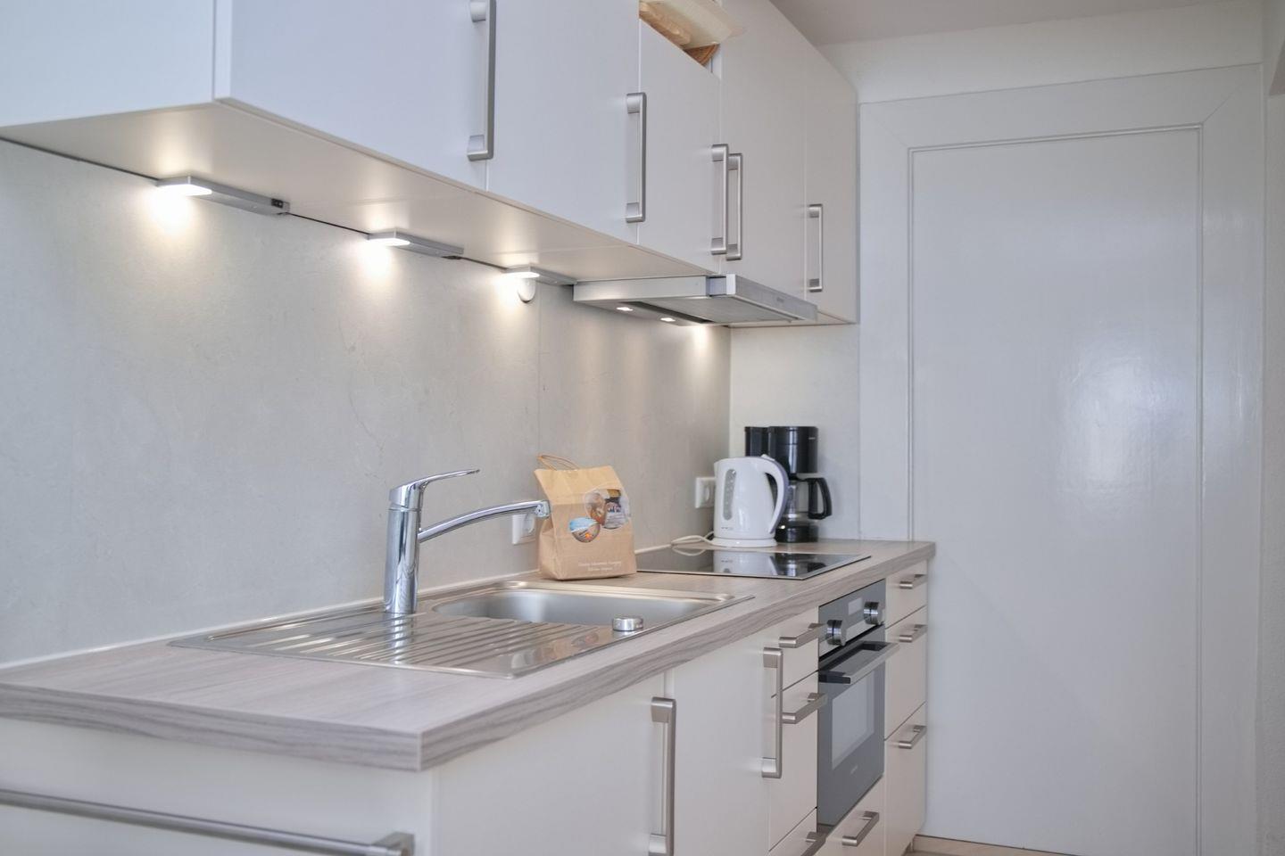 Die Küchenzeile ist ausgestattet mit einem Cerankochfeld, einem Backofen, einem Kühlschrank mit Gefrierfach, einer Kaffeemaschine, einem Toaster und einem Wasserkocher.