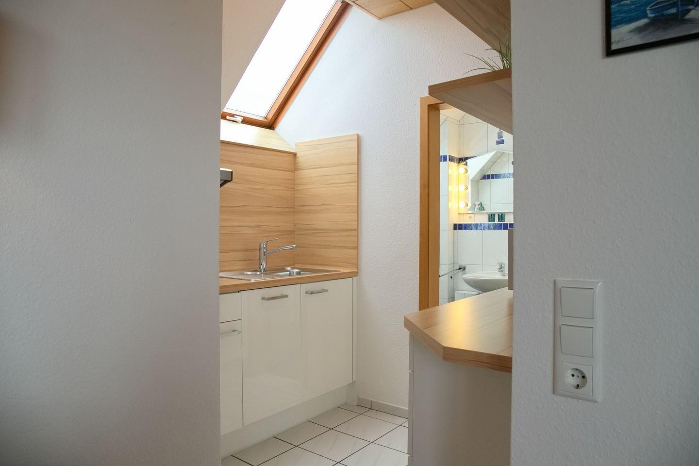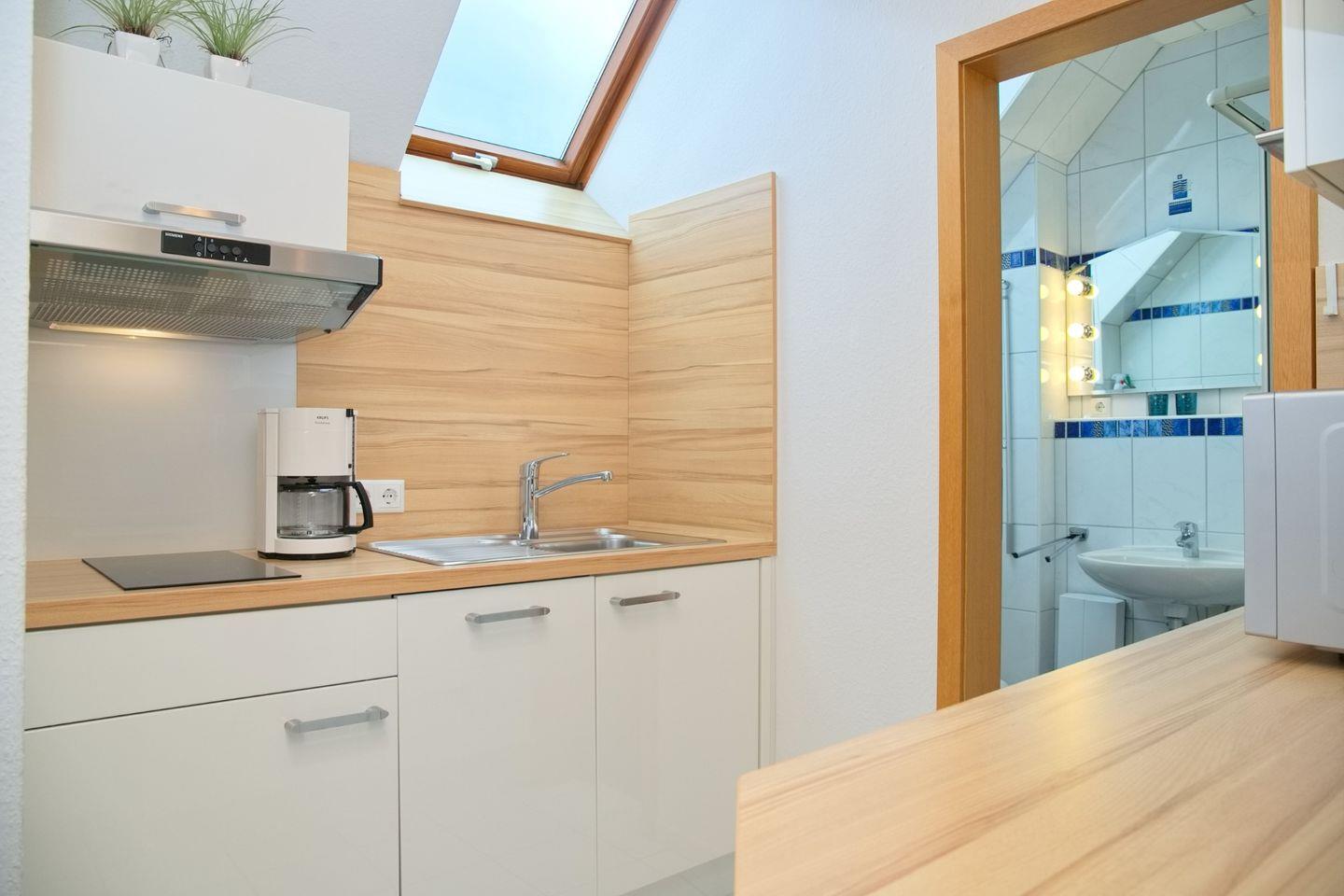 Die offene Küche ist komplett ausgestattet mit Ceranfeld, Kühlschrank,