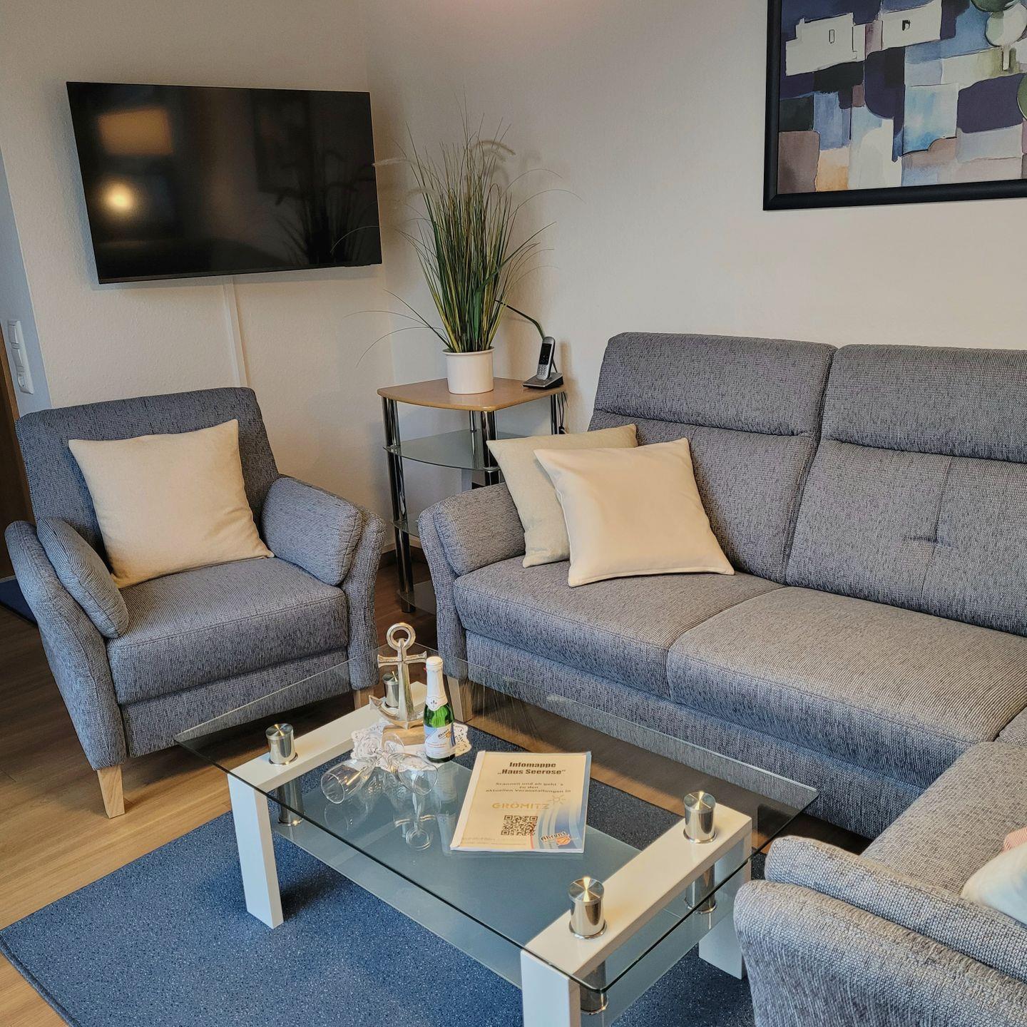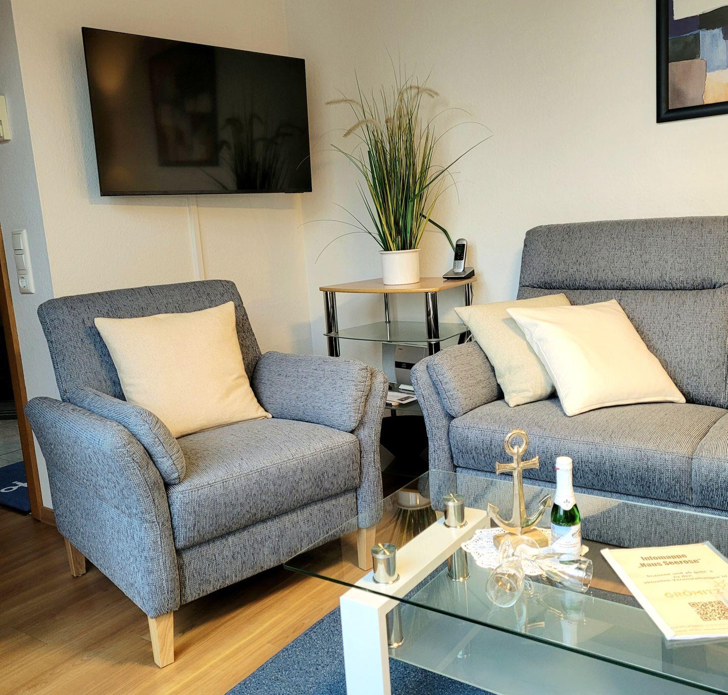 bietet. Im Wohnzimmer erwartet Sie eine bequeme Schlafcouch und ein Sessel,