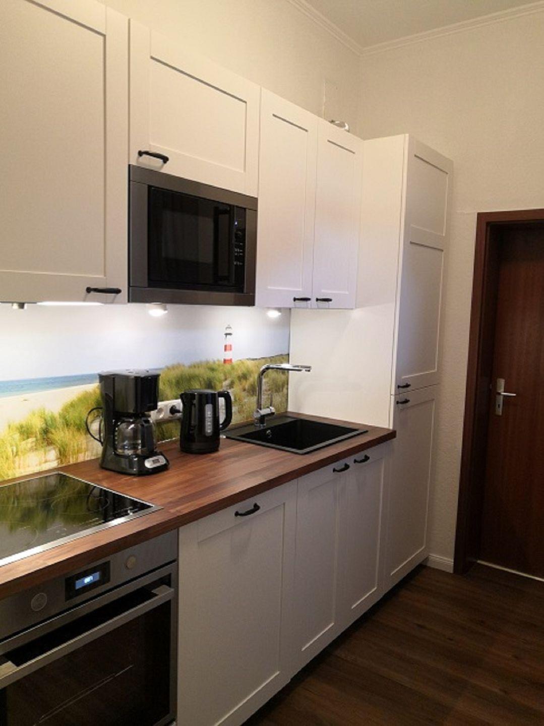 Sehr schöne helle und moderne 3-Zimmer-Wohnung in der ersten Etage mit möbliertem Balkon mit eingeschränktem Meerblick und einer separaten, teilweise überdachten Terrasse. Vom Balkon aus können Sie das Meer rauschen hören. Im Wohnzimmer gibt es eine große Schlafcouch (140 x 200 cm) für 2 Personen, einen Sessel, eine Kommode, einen 37-Zoll-Flachbildfernseher, ein Radio mit USB- und MP3-CD-Player und eine Essecke mit 6 Stühlen. Hier können Sie den Urlaubstag ausklingen lassen und den nächsten Tag planen. Starten Sie hier einfach Ihren Urlaubstag mit einem leckeren Frühstück. Die separate Küche ist ausgestattet mit einem Induktionskochfeld und Dunstabzug, einem Backofen, einem großen Kühlschrank mit Gefrierfach, einem Geschirrspüler, einer Mikrowelle, einer Kaffeemaschine, einem Wasserkocher und einem Toaster.