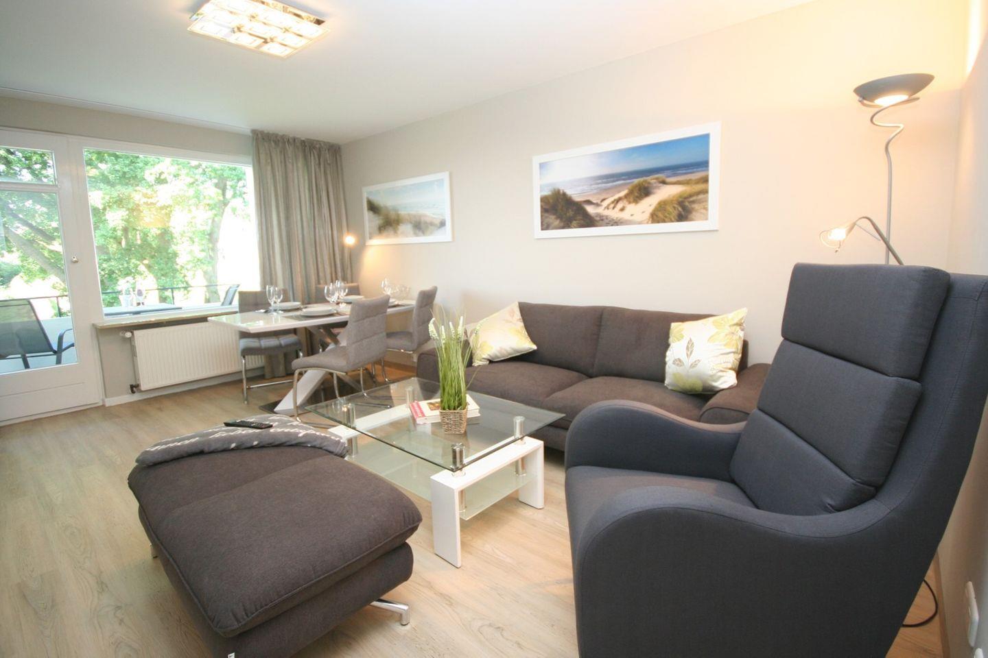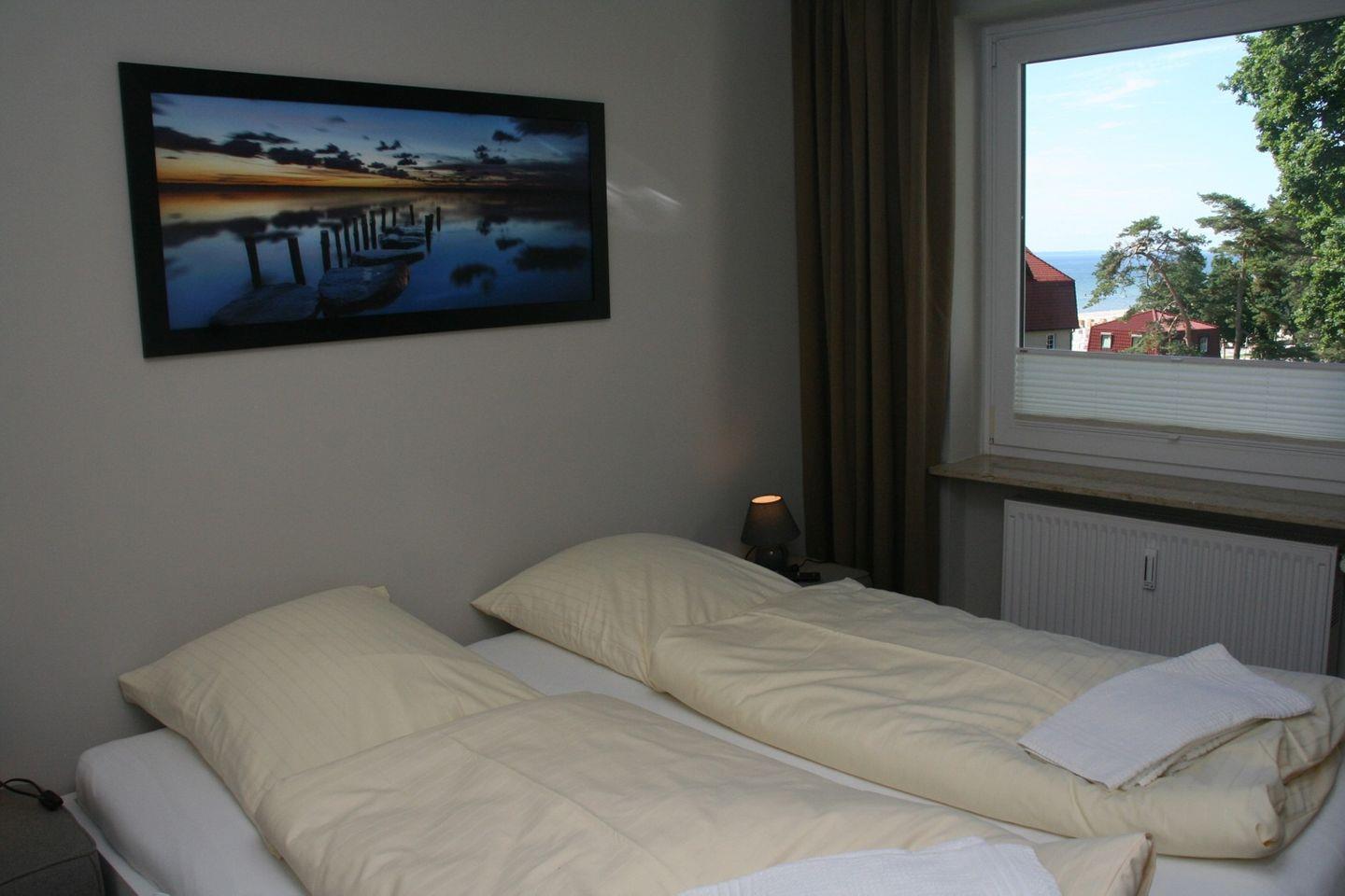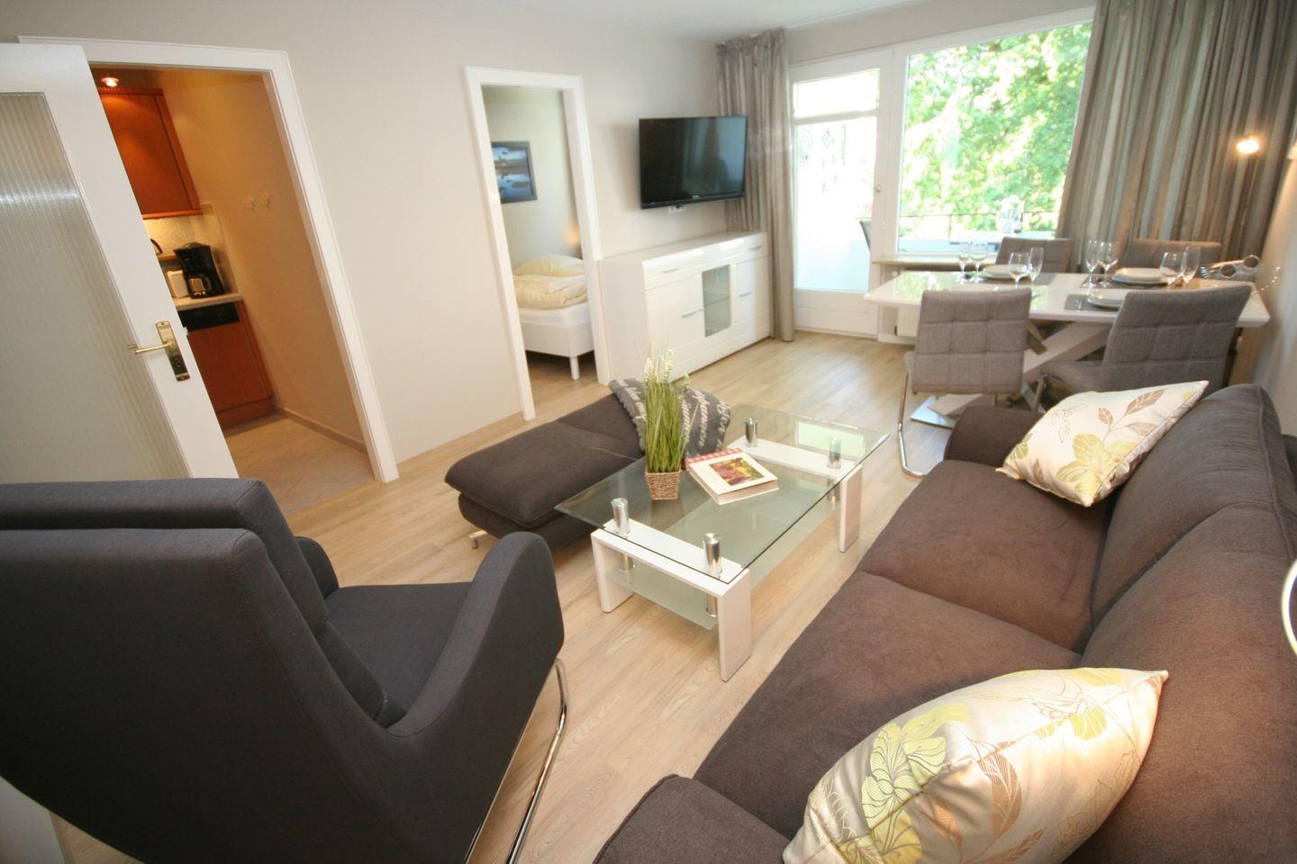 3 Zimmer-Ferienwohnung im 4. Obergeschoss mit möblierten Westbalkon und Teilseeblick. Nur wenige meter vom Strand und der Promenade in Grömitz entfernt.