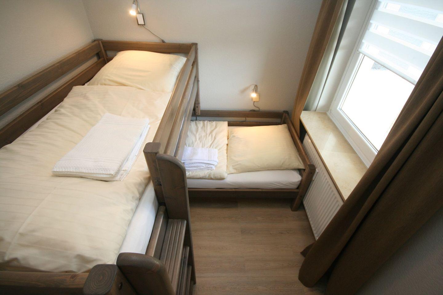 Das Kinderzimmer hat ein praktisches Ecketagenbett. Helles Tageslicht empfängt Sie im Bad das mit einer Dusche, einem WC, einen Waschtisch und einen Spiegelschrank ausgestattet ist.