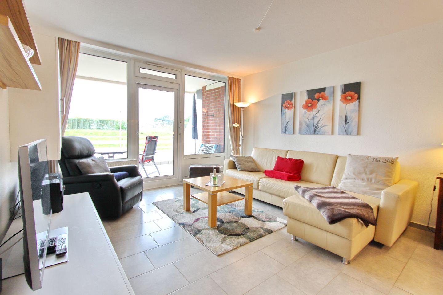 Stilvolle 2 Zimmerwohnung hinter dem Deich nur 80 Meter vom Meer entfernt inkl. WLAN und 2. TV im Schlafzimmer. Möblierter Südbalkon in ruhiger Lage.