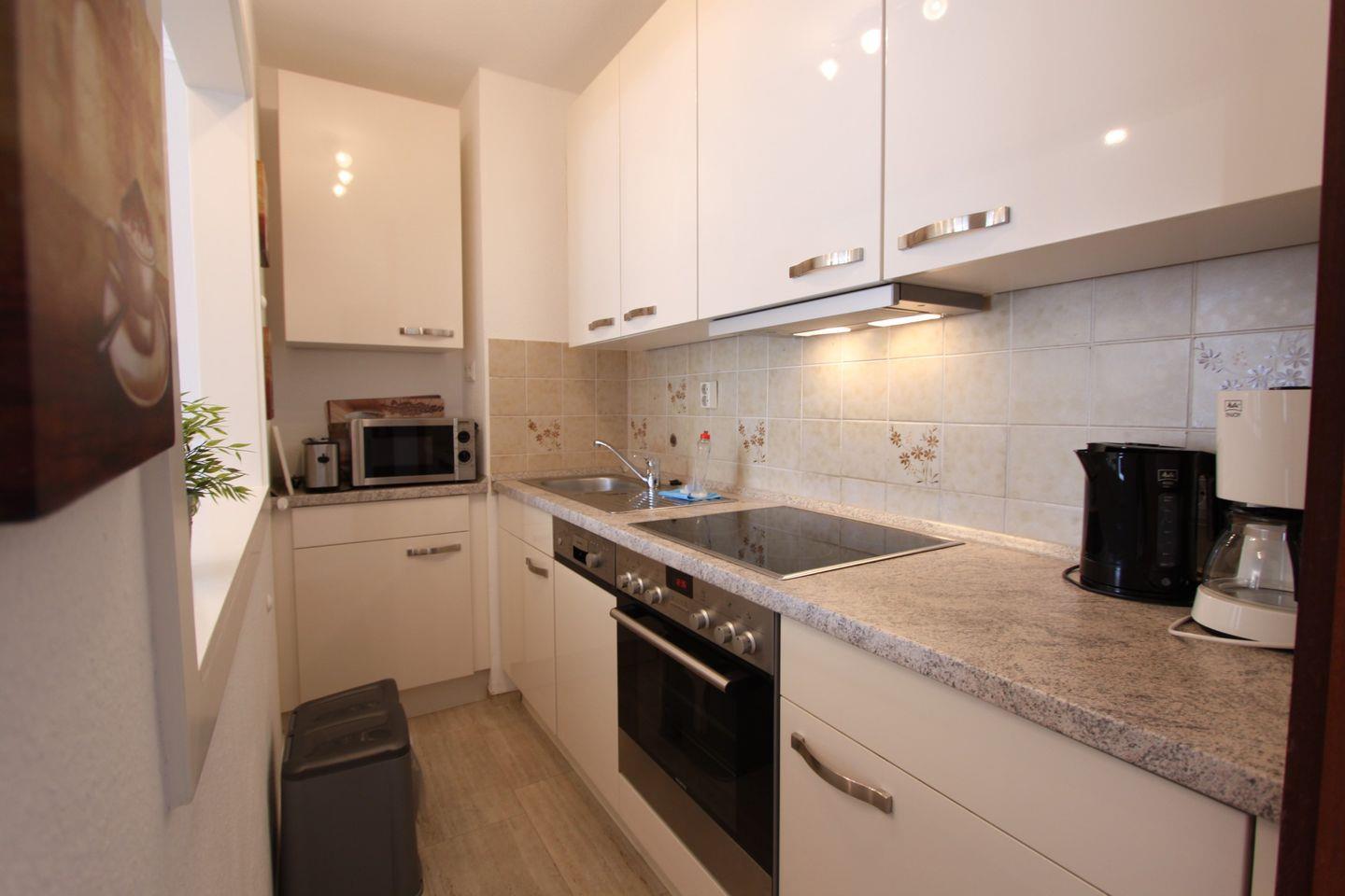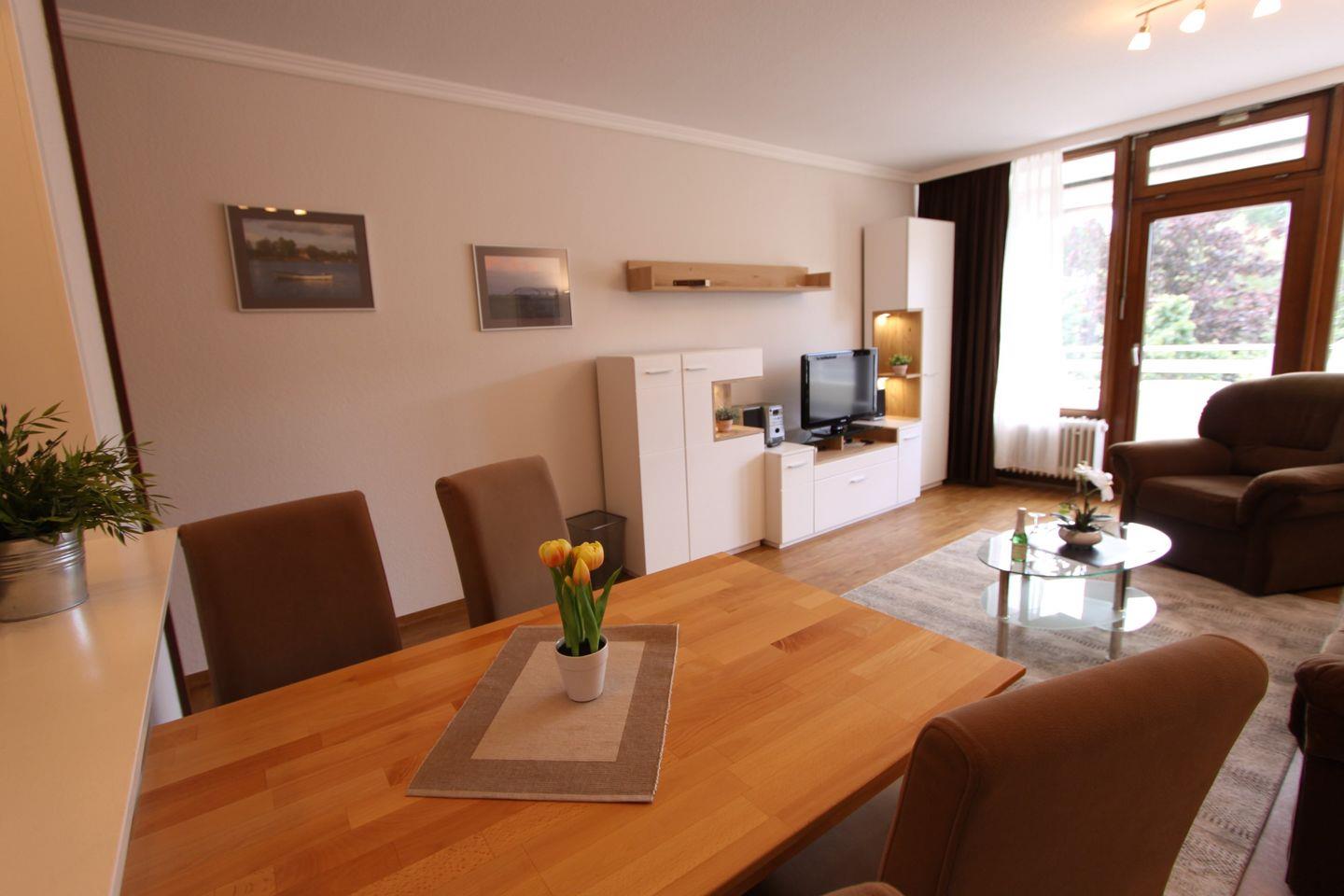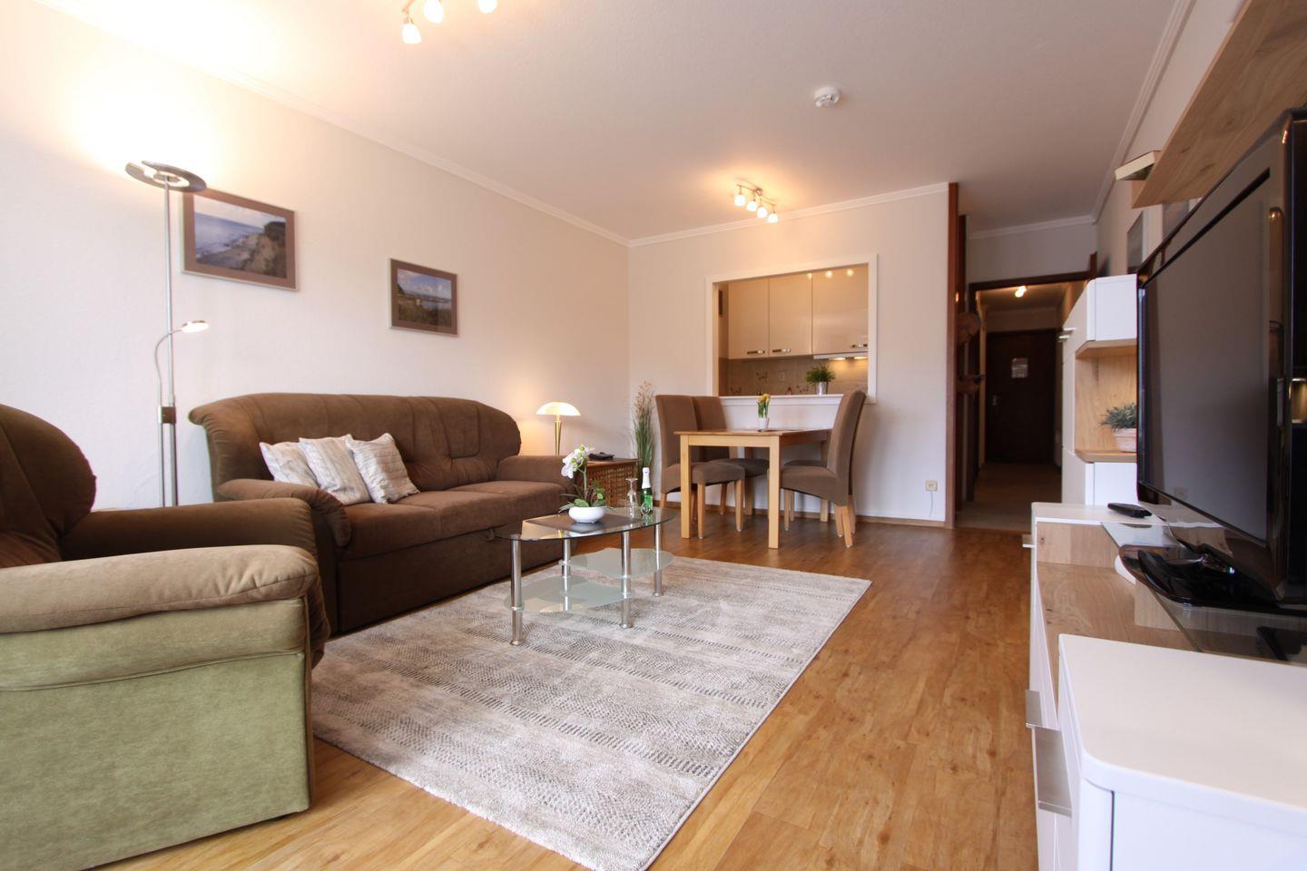Liebevoll eingerichtete 2-Zimmerwohnung (ca. 47 qm) mit kostenfreiem WLAN in der 2. Etage mit möbliertem Balkon in Südwestlage. Durch den Flur gelangen Sie direkt in das geräumige Wohnzimmer, hier gibt es eine Schlafcouch für 2 Personen, einen Flatscreen, ein Radio mit CD- Player und einen Essbereich mit 4 Stühlen. Die Küche ist durch einen kleinen Tresen vom Wohnraum abgetrennt und ist mit einem Ceranfeld mit Backofen, Geschirrspüler, einem Kühlschrank mit Gefrierschrank, einer Mikrowelle, einer Kaffeemaschine, Wasserkocher und Toaster ausgestattet. Das Schlafzimmer ist durch 2 Türen begehbar. Hier befinden sich ein Doppelbett, zwei Nachttische und ein Kleiderschrank. Auch hier steht Ihnen ein Flatscreen zur Verfügung. Die Wohnung verfügt über ein Duschbad/WC.