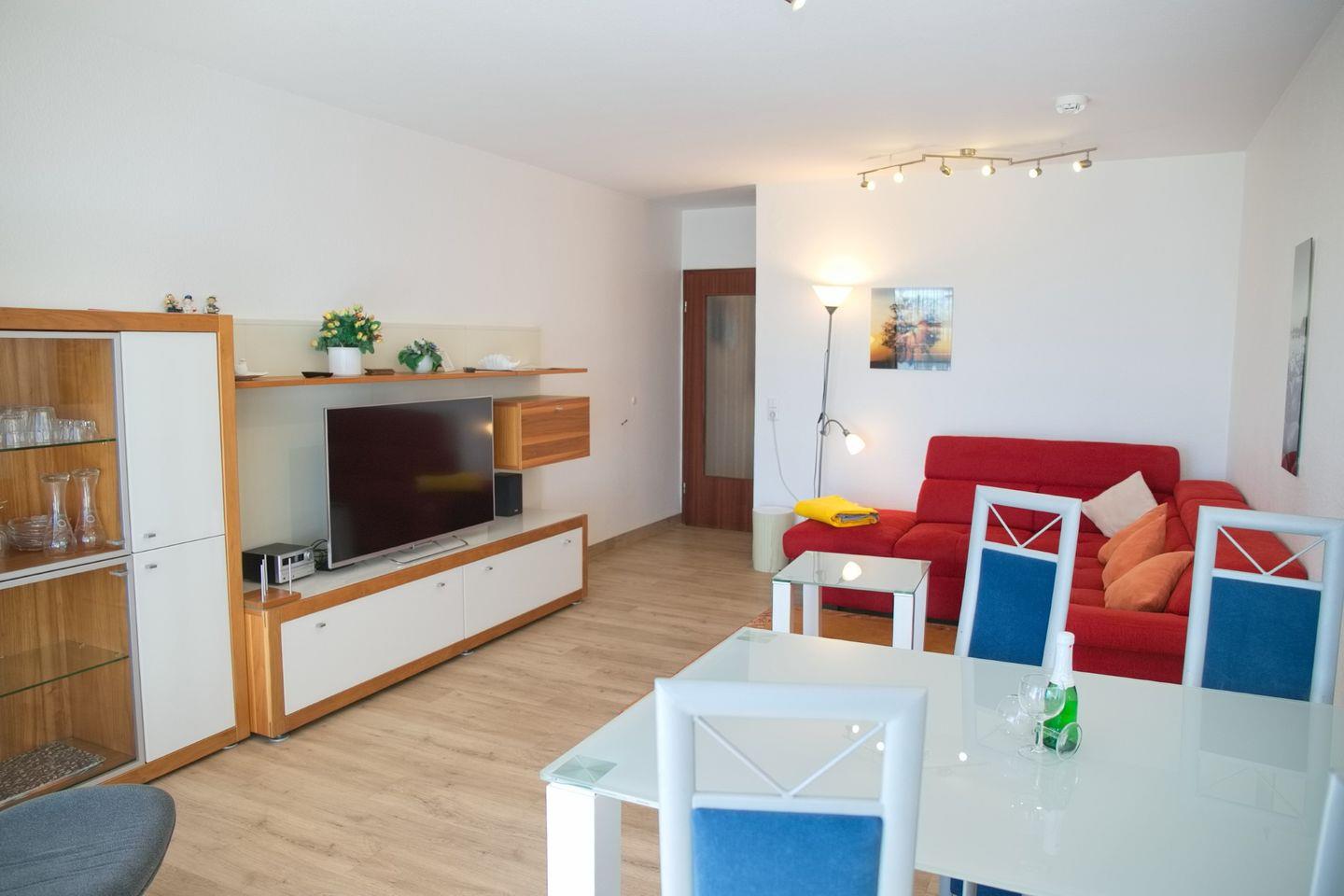 Das Appartement erstreckt sich über eine großzügige Fläche von 53 m² und bietet Platz für bis zu vier Personen. Es verfügt über ein komfortables Schlafzimmer sowie eine gemütliche Sofaecke im Wohnzimmer, die zusammen für eine einladende Atmosphäre sorgen. Die Unterkunft ist ideal für Familien, Paare oder Freunde, die eine erholsame Zeit suchen. Die Räumlichkeiten sind geschmackvoll eingerichtet und bieten Ihnen sowohl Ruhe als auch die Möglichkeit, gesellige Stunden im Kreise Ihrer Liebsten zu verbringen.