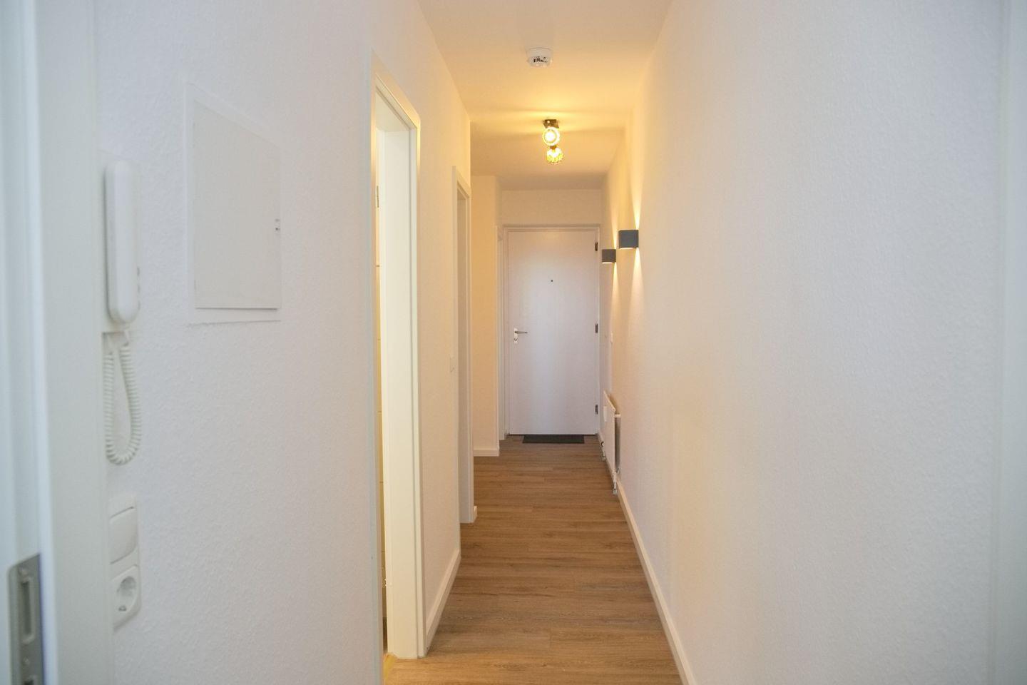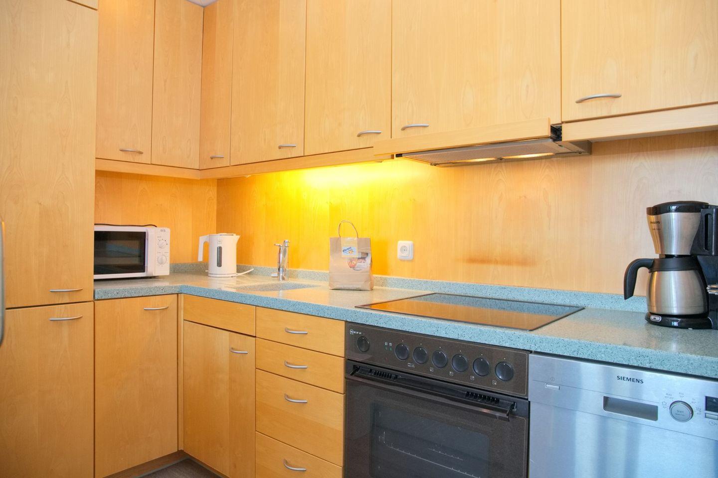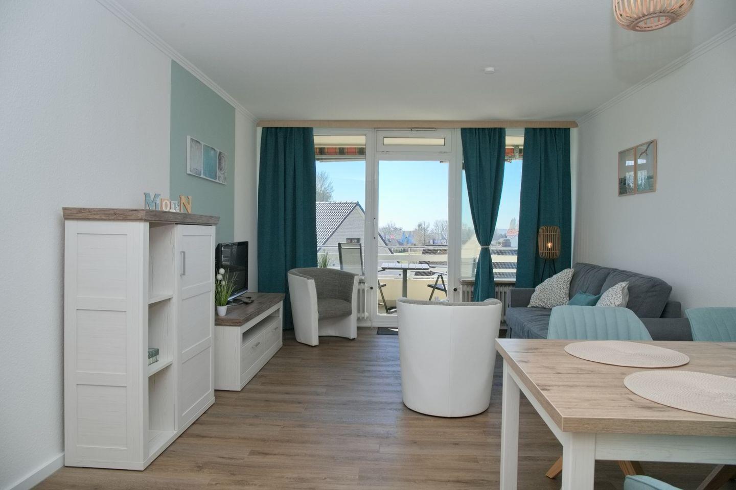 Schicke 2-Zimmer-Wohnung (ca. 52 qm) in der 3. Etage mit möbliertem Balkon in Südwestlage. Im Wohnzimmer gibt es eine Schlafcouch für 2 Personen (140 x 200 cm), 2 kleine Sessel, einen Flatscreen, ein Radio, und einen Essbereich für 4 Personen. Die Küche ist mit einem Ceranfeld mit Backofen, Kühlschrank mit Gefrierschrank, einer Spülmaschine, einer Kaffeemaschine, Wasserkocher und Toaster ausgestattet. Das Schlafzimmer ist durch 2 Türen begehbar, hier befindet sich ein Doppelbett, zwei Nachttische und ein Kleiderschrank. Die Wohnung verfügt über ein begehbare Dusche und WC.