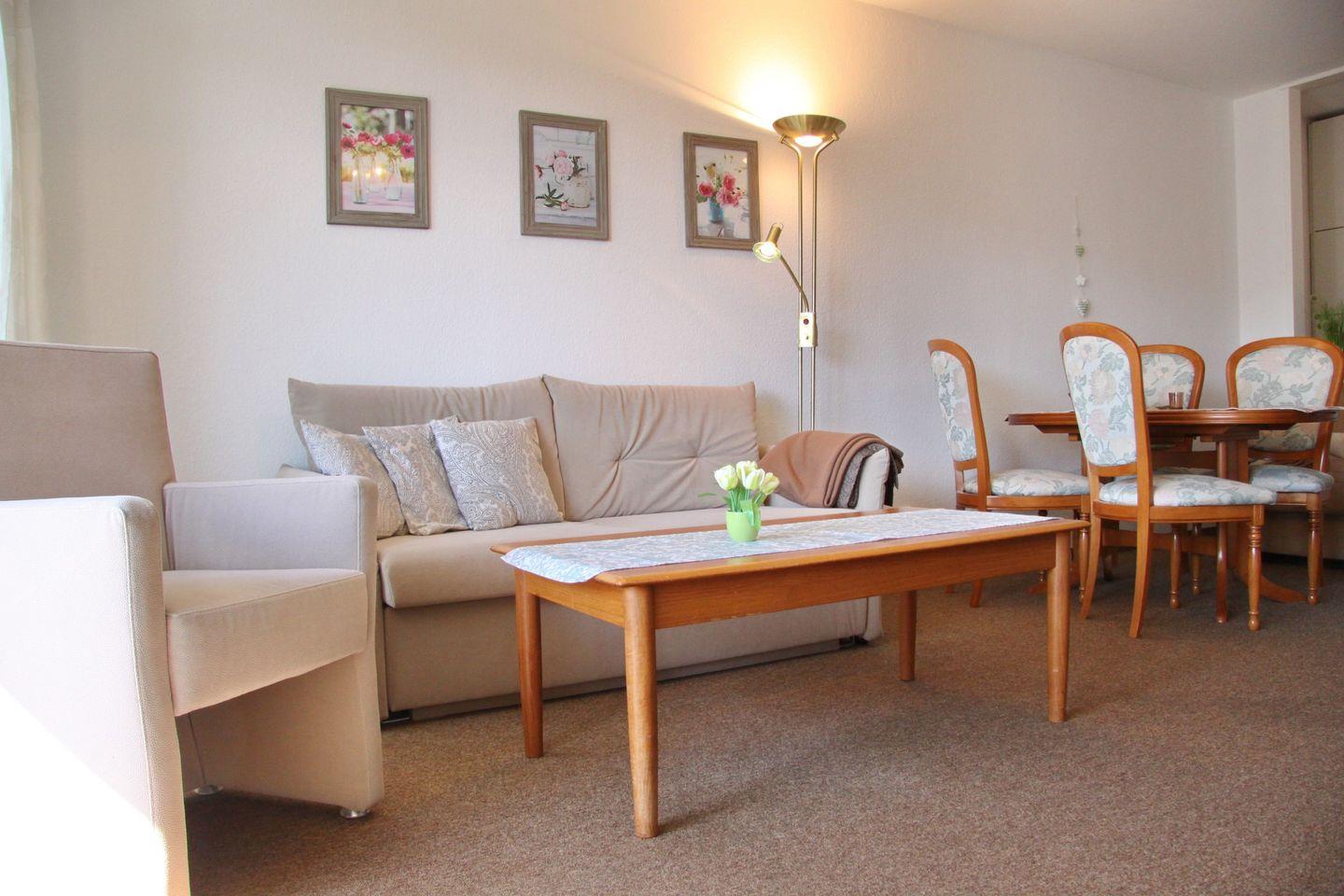 Im Wohnzimmer gibt es eine Schlafcouch für 2 Personen, einen 2-Sitzer und einen Sessel, ein Flach-TV und eine Essecke mit 4 Stühlen an dem Sie Ihren Urlaubstag mit einem ausgiebigen Frühstück starten können oder den Urlaub bei einem gemütlichen Spieleabend ausklingen lassen können. Kostenloses WLAN steht Ihnen in dieser Wohnung zur Verfügung. Die offene, neue Küche ist ausgestattet mit einem Ceranfeld, Kühlschrank mit Gefrierfach, einer Mikrowelle einer Kaffeemaschine, Wasserkocher und Toaster. Im Schlafzimmer befinden sich ein Doppelbett, Kleiderschrank und zwei Nachttische. Die Wohnung verfügt über ein neues modernes Duschbad/WC.