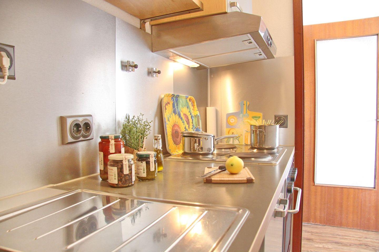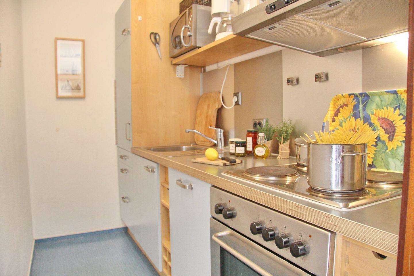 Die Küche ist mit einem 4-Plattenherd mit Backofen, einem Kühlschrank, einer Spülmaschine, einer Mikrowelle, einer Kaffeemaschine, einem Wasserkocher und einem Toaster ausgestattet. Im Schlafzimmer befinden sich ein Doppelbett, zwei Nachttische und ein Kleiderschrank. Die Wohnung verfügt über ein Duschbad/WC.