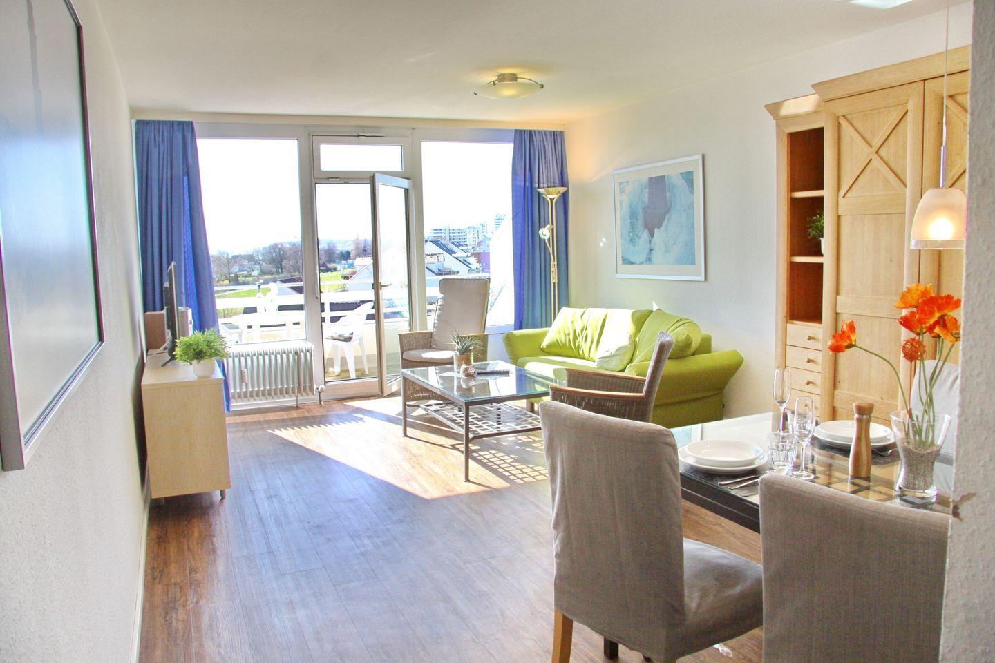 Sehr schöne 2-Zimmer-Wohnung (ca. 52 qm) in der 4. Etage mit möbliertem Balkon in Südwestlage mit Teilseeblick. Im Wohnzimmer gibt es eine Schlafcouch für 2 Personen, 2 separate Sessel mit Liegefunktion, ein TV, ein Radio mit CD-Player und eine Essecke mit 4 Stühlen an dem Sie bei einem ausgiebigen Frühstück Ihren Tag starten können. Von hier aus gelangen Sie auch auf den möblierten Balkon auf dem Sie die Mittagssonne bis in den Abend genießen können.