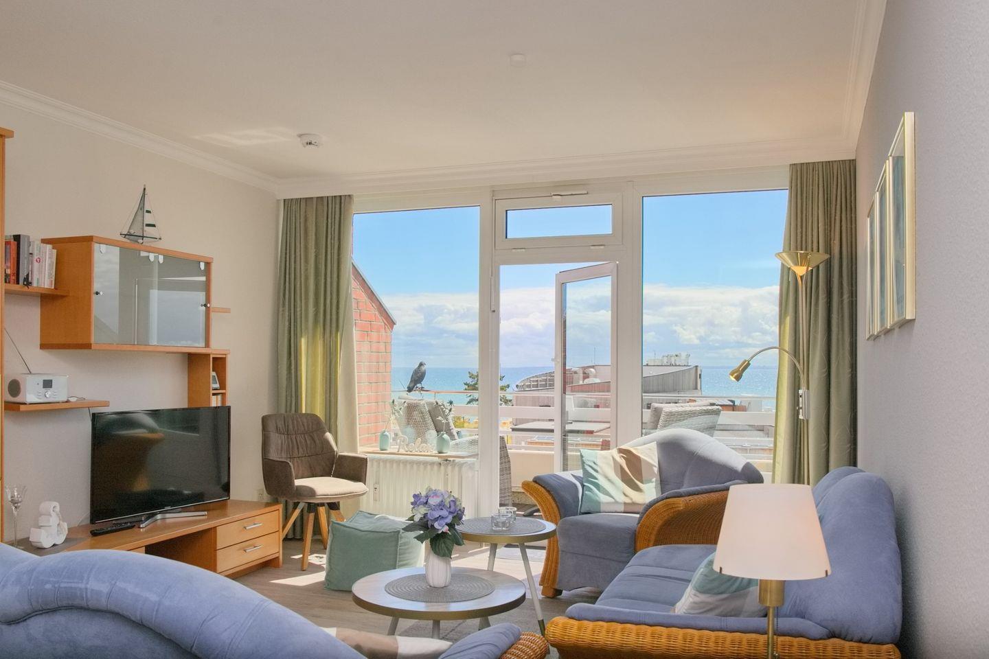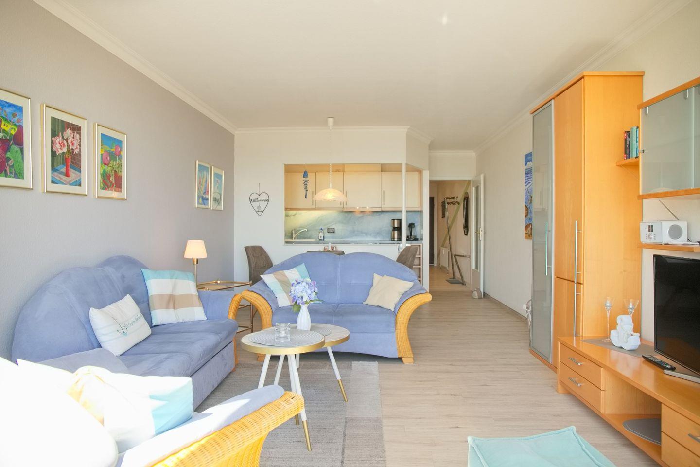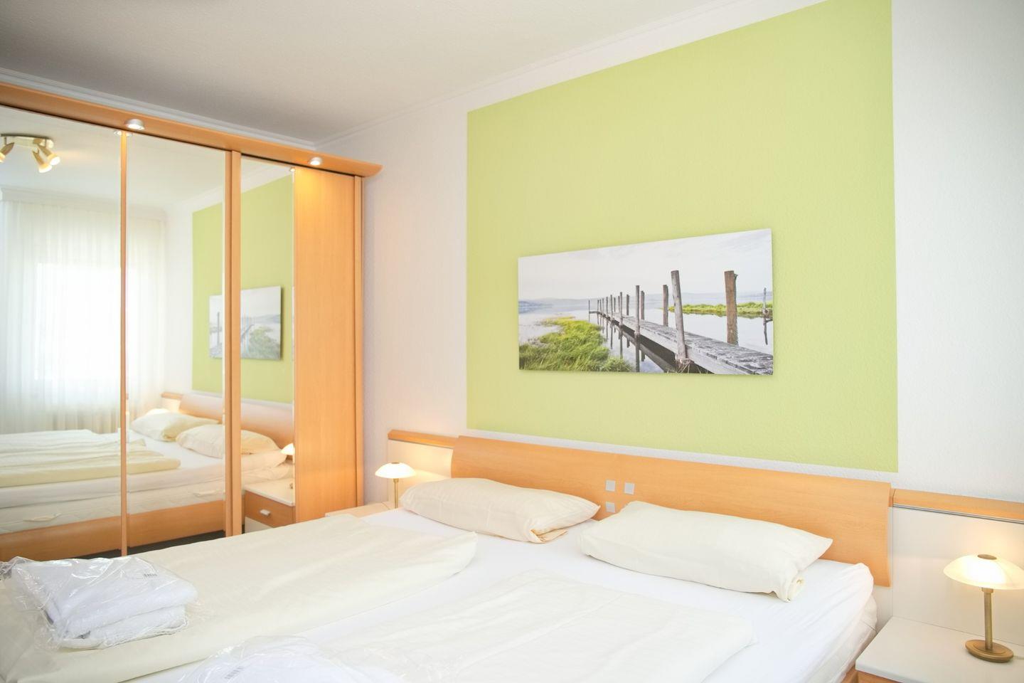 Eine gemütliche 2-Zimmer-Wohnung (ca. 52 qm) in der 4. Etage mit möbliertem Balkon in Südrichtung mit Markise und traumhaftem Seeblick. Im Wohnzimmer gibt es eine Schlafcouch für eine Person, einen 2 Sitzer und einen Sessel, Flach- TV mit HD Programmen, ein Radio mit CD-Player und eine Essecke mit 4 Stühlen. Die Küche ist mit einem Induktionsherd, einem Kühlschrank mit Gefrierfach, einer Spülmaschine, einer Mikrowelle, einer Kaffeemaschine, einem Wasserkocher und einem Toaster ausgestattet. Im Schlafzimmer befinden sich ein Doppelbett, zwei Nachttische und ein großer Kleiderschrank. Außenrollläden sorgen für einen tiefen Schlaf. Die Wohnung verfügt über ein Duschbad/WC und kostenlosem WLAN.