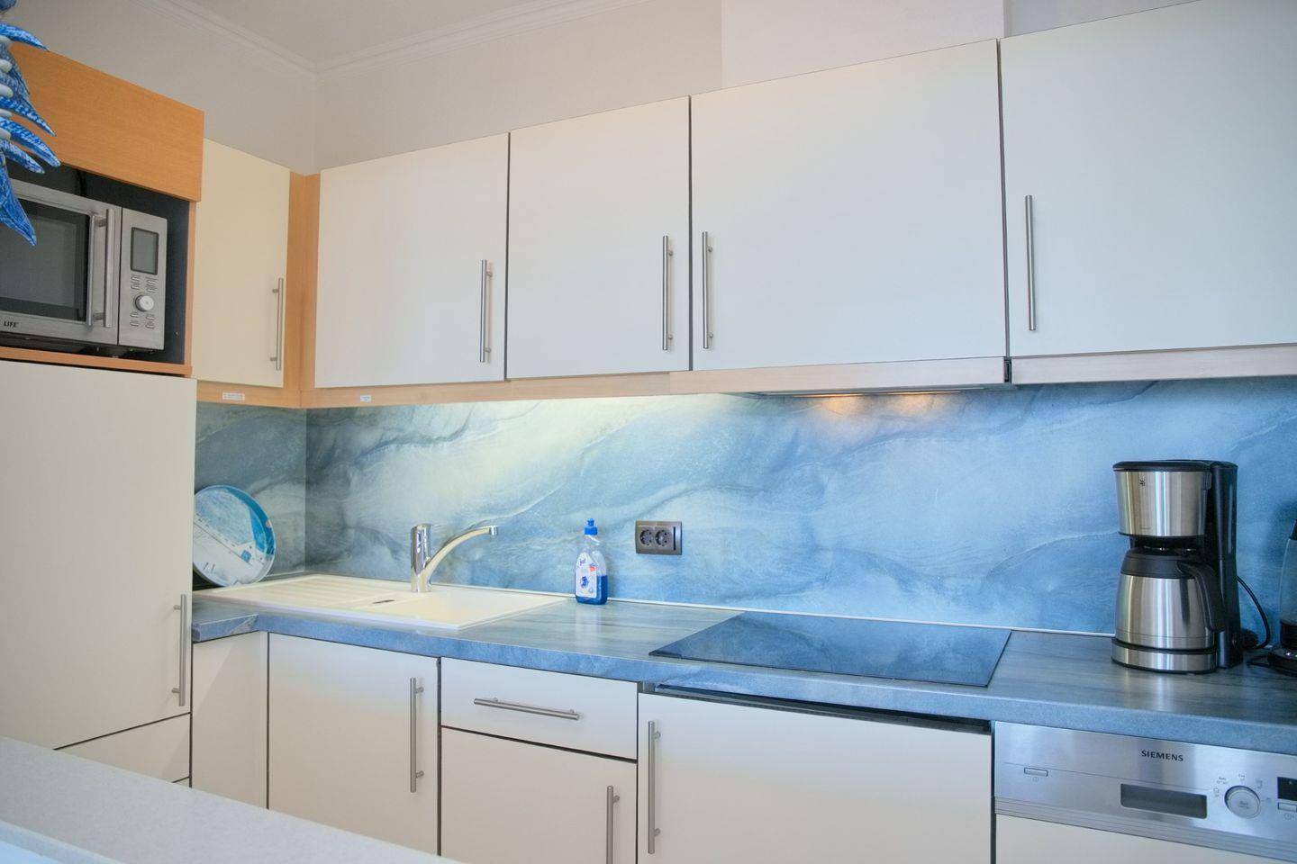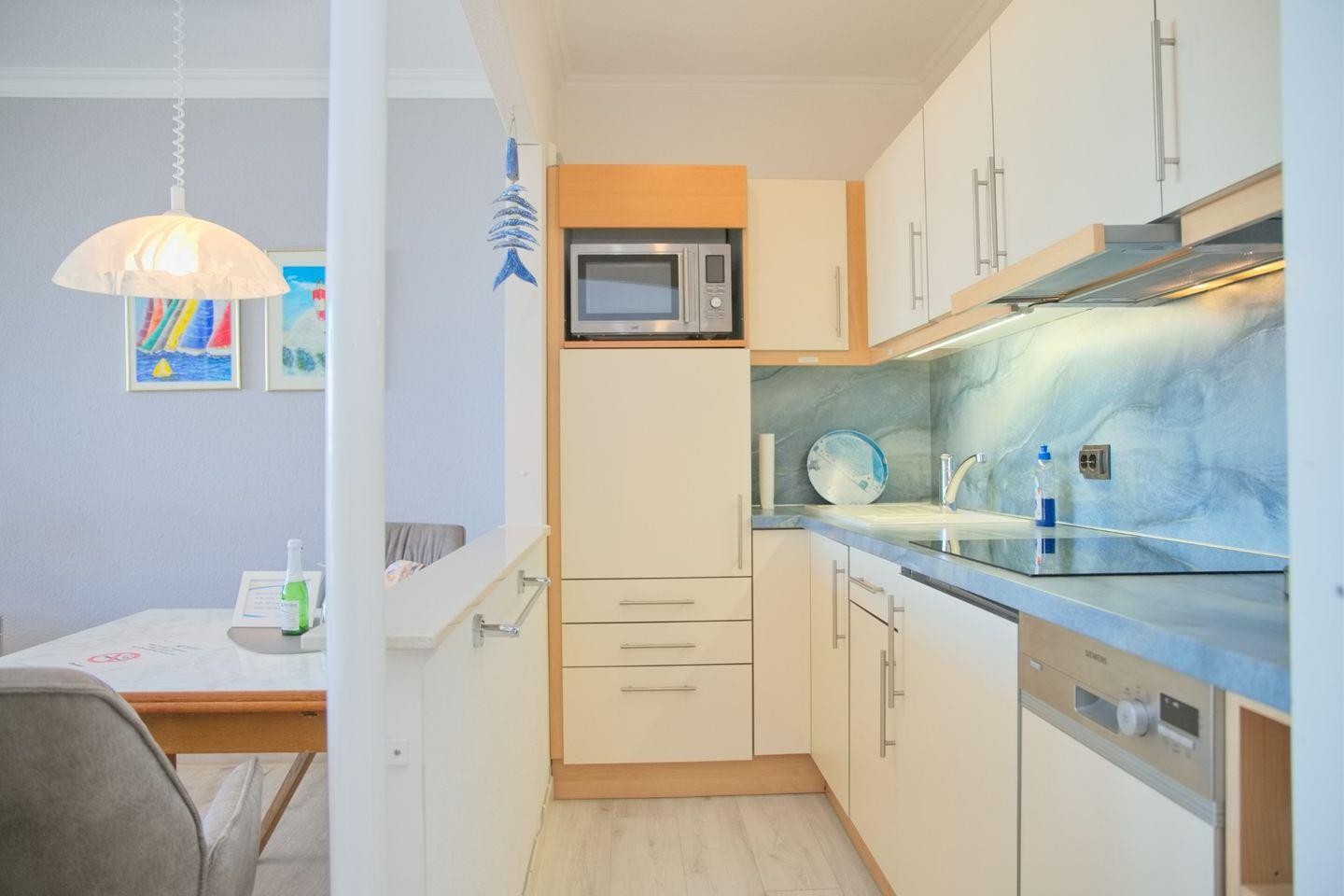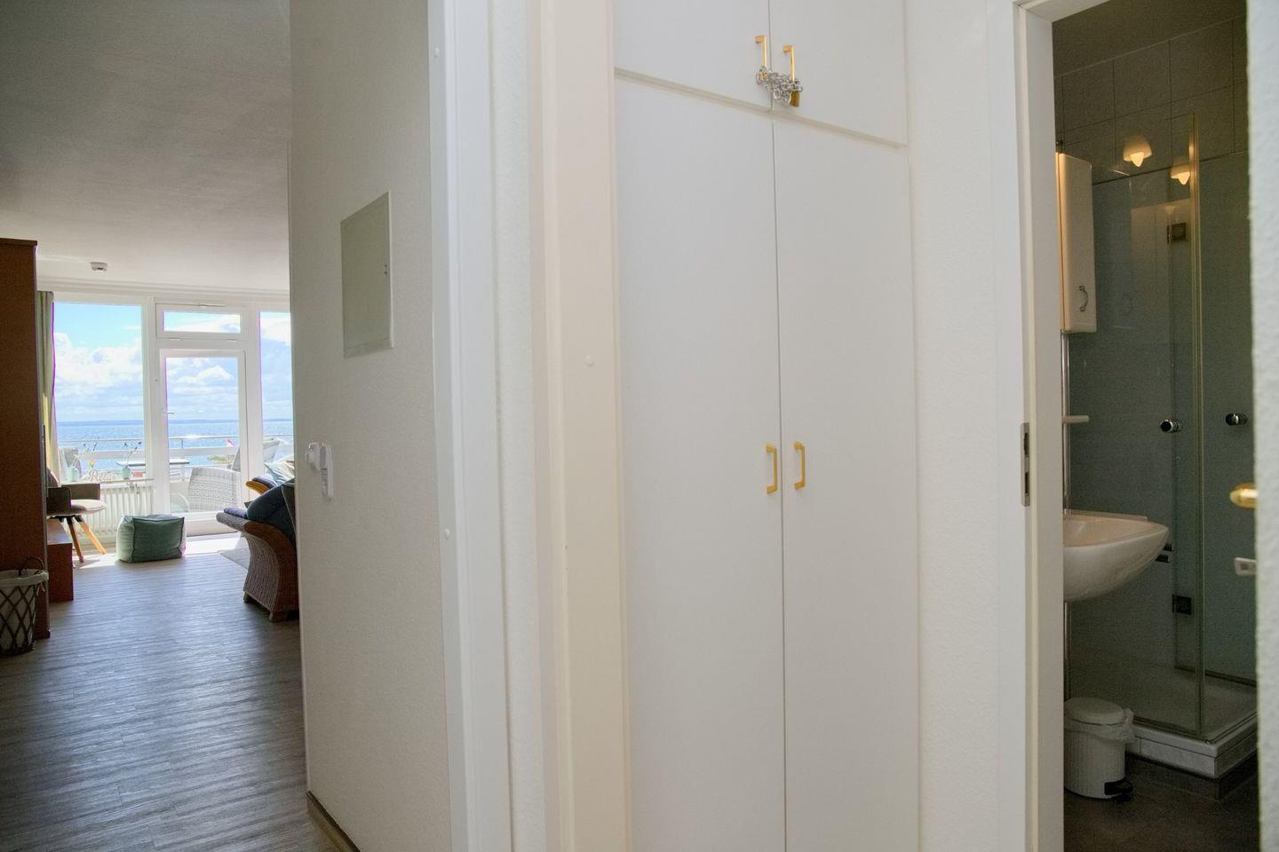 Eine gemütliche 2-Zimmer-Wohnung (ca. 52 qm) in der 4. Etage mit möbliertem Balkon in Südrichtung mit Markise und traumhaftem Seeblick. Im Wohnzimmer gibt es eine Schlafcouch für eine Person, einen 2 Sitzer und einen Sessel, Flach- TV mit HD Programmen, ein Radio mit CD-Player und eine Essecke mit 4 Stühlen. Die Küche ist mit einem Induktionsherd, einem Kühlschrank mit Gefrierfach, einer Spülmaschine, einer Mikrowelle, einer Kaffeemaschine, einem Wasserkocher und einem Toaster ausgestattet. Im Schlafzimmer befinden sich ein Doppelbett, zwei Nachttische und ein großer Kleiderschrank. Außenrollläden sorgen für einen tiefen Schlaf. Die Wohnung verfügt über ein Duschbad/WC und kostenlosem WLAN.