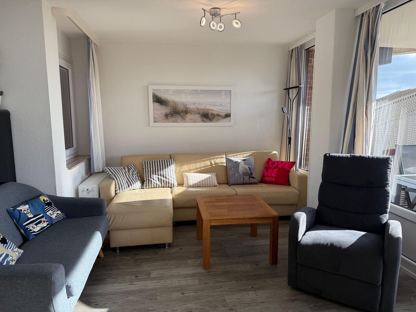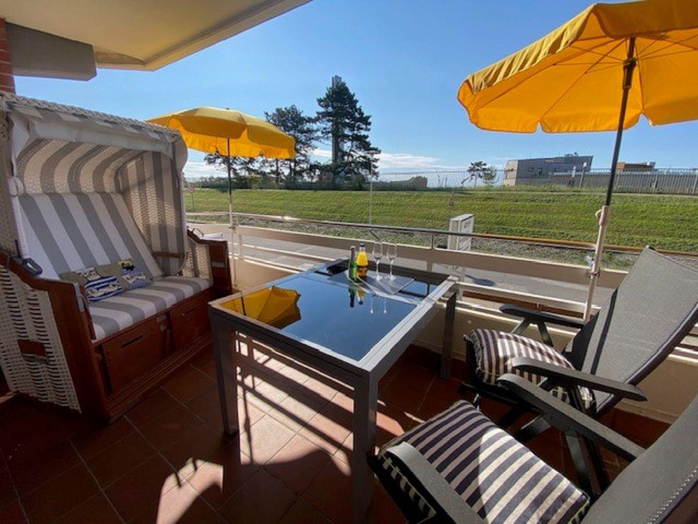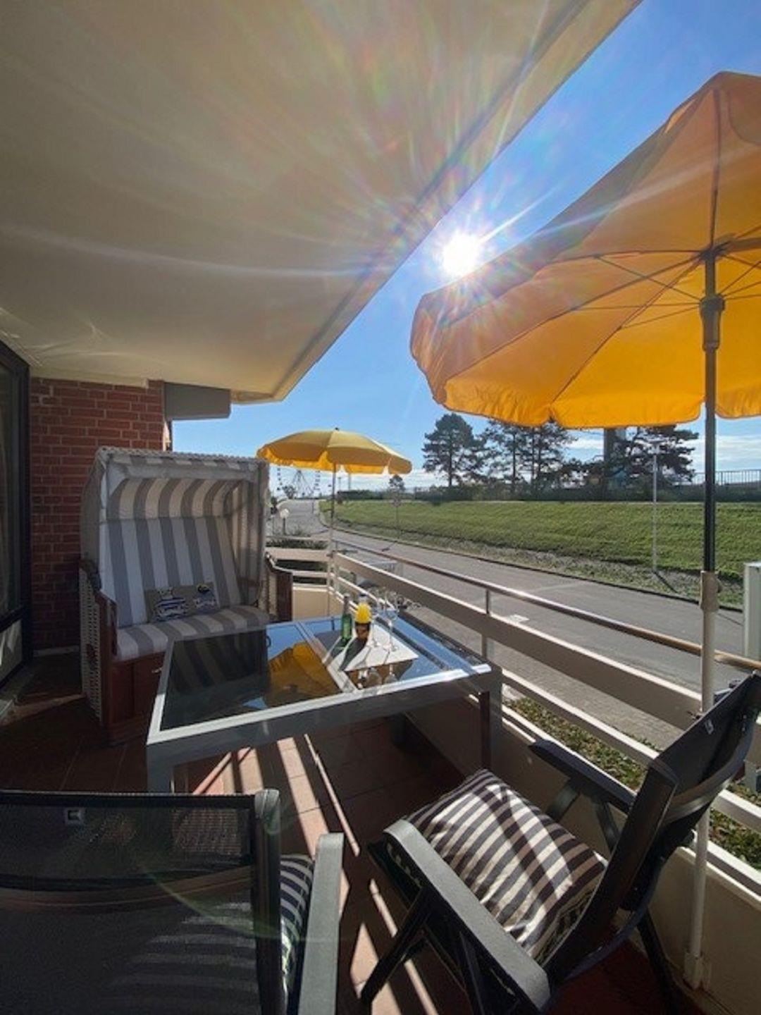 Familienfreundliche 3 Zimmerwohnung in der 1. Etage. Großer möblierter Balkon mit Strandkorb in Südlage direkt hinter dem Deich nur 80 Meter vom Meer entfernt.
