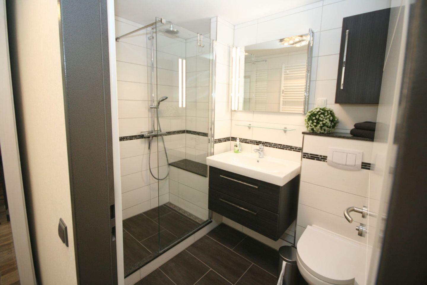 Die Wohnung verfügt über ein stilvolles Vollbad /WC mit Duschabtrennung und einem beleuchteten Spiegel.