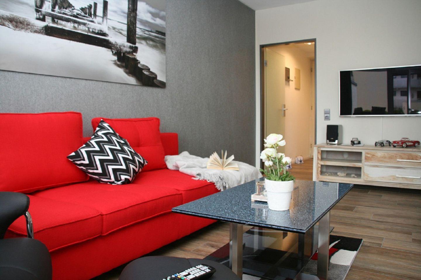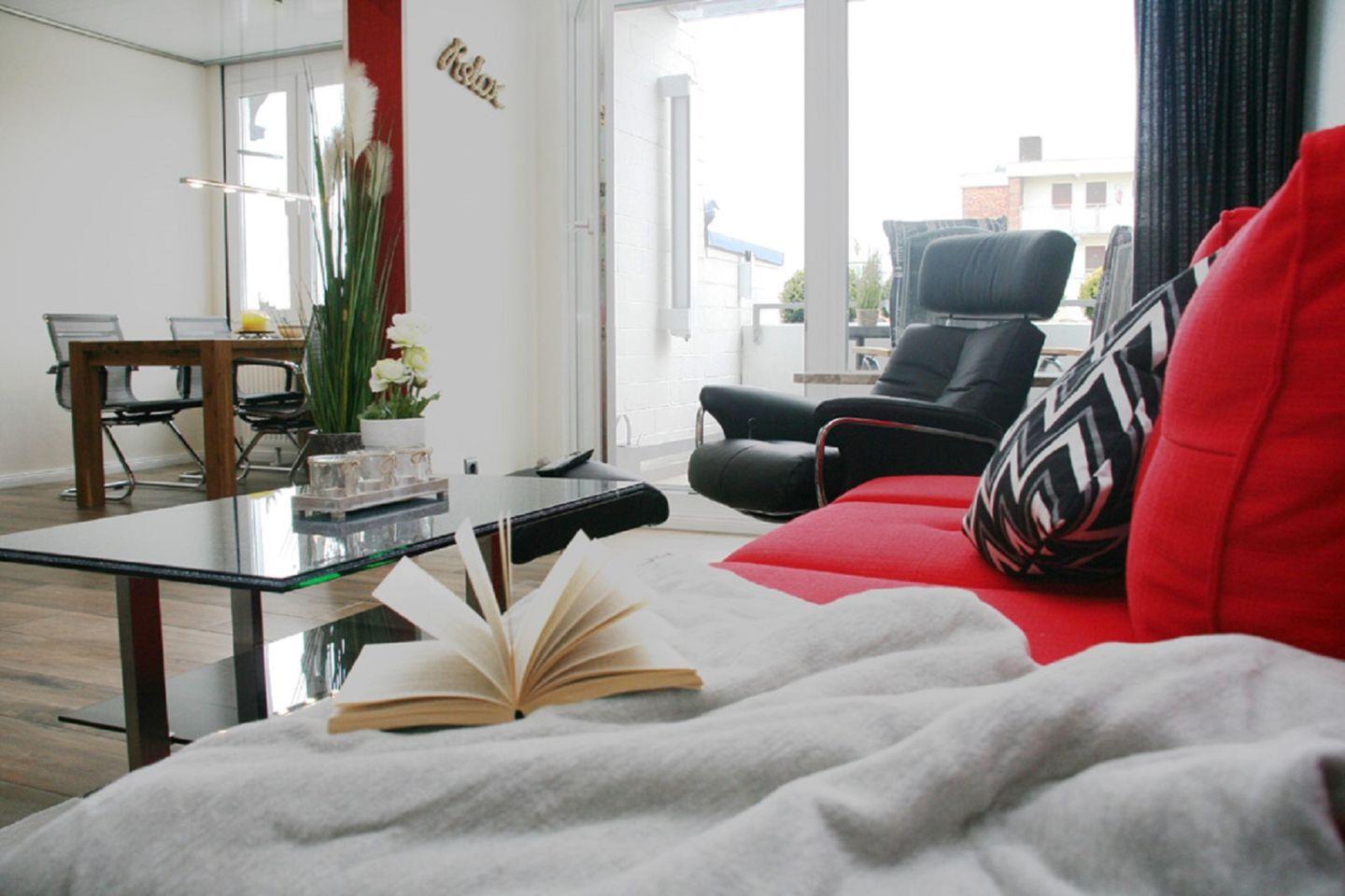 Moderne und stilvoll eingerichtete Ferienwohnung mit möbliertem Süd-/ Westbalkon und Seeblick. Nur 50 meter zum schönen Sandstrand in Grömitz.