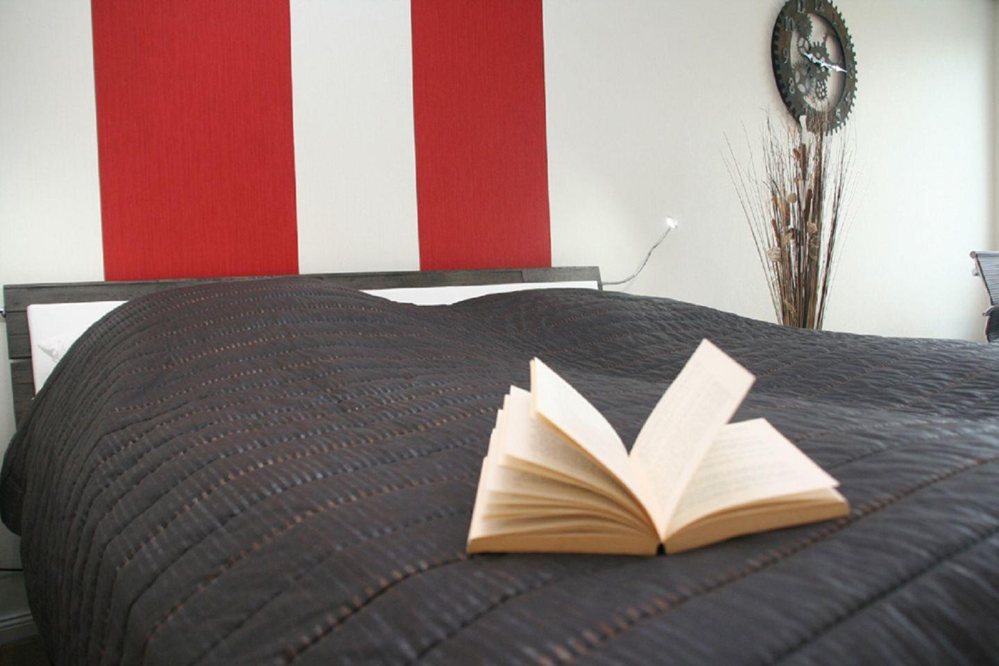 Im liebevoll eingerichteten Schlafzimmer, das zum Wohnzimmer offen ist, steht ein Doppelbett.