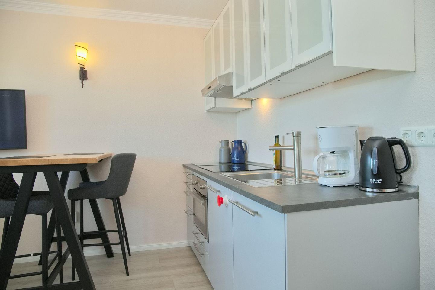 Die offene Einbauküche ist ein Traum für Hobbyköche. Von einem Cerankochfeld über ein Mikrowellen-Kombi-Gerät mit Backfunktion bis hin zu einem Kühlschrank mit Gefrierfach und einer Kaffeemaschine ist alles vorhanden, was Sie für die Zubereitung köstlicher Speisen benötigen.