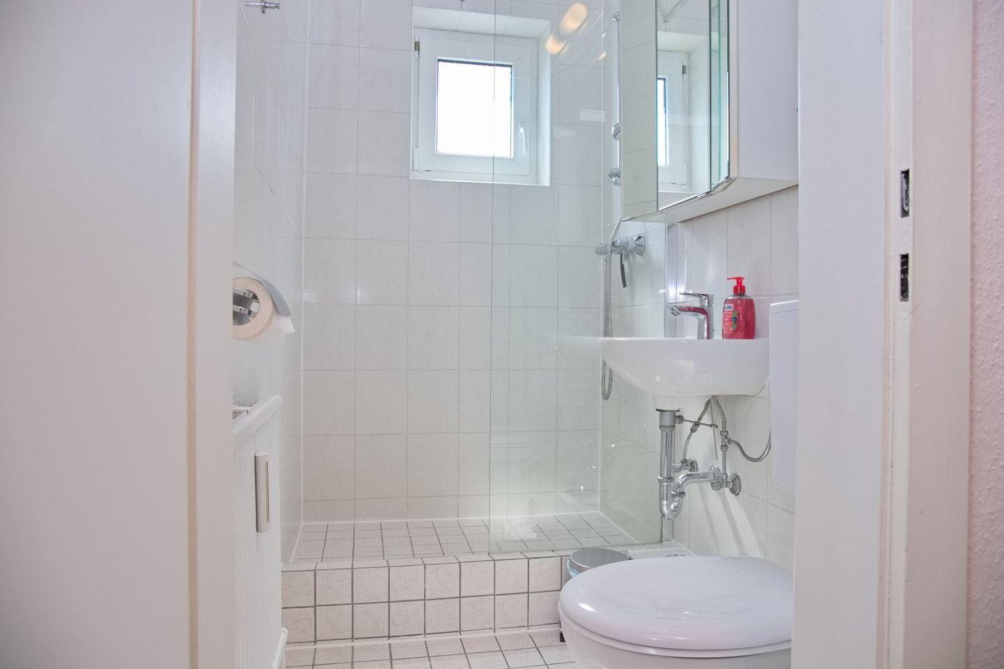 Das Badezimmer ist ein Ort der Erfrischung und Entspannung, ausgestattet mit einer erfrischenden Dusche, einem WC, einem Waschbecken und einem Spiegelschrank mit Beleuchtung. Im Flur begrüßt Sie eine praktische Garderobe mit Haken und Kleiderbügel mit Spiegel.