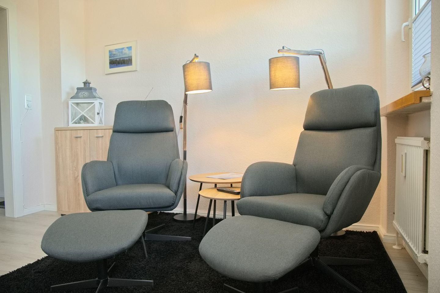 Im Wohnzimmer lädt eine behagliche Atmosphäre zum Verweilen ein. Kuscheln Sie sich in die weichen TV-Sessel mit Kopfunterstützung und Fussbank, während Sie Ihre Lieblingssendungen auf dem Fernseher verfolgen oder Ihr Lieblingsbuch genießen. Der kleine separate Schrank bietet Stauraum für Ihren persönlichen Einkauf und der Essbereich mit seinem einladenden Tresen und den gemütlichen Barstühlen lädt zu entspannten Mahlzeiten oder Tasse Kaffee mit Blick aufs Meer ein.