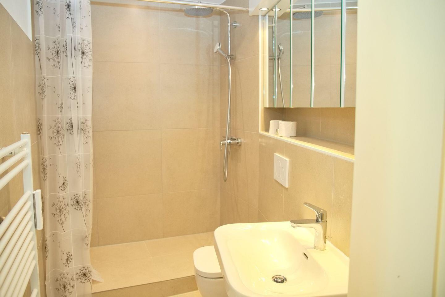 Ein modernes Badezimmer mit Dusche und WC rundet die Ausstattung ab und sorgt für zusätzlichen Komfort während Ihres Aufenthaltes. Die gemeinschaftliche Waschmaschine und der Trockner in der Anlage stellen sicher, dass Sie auch während längerer Urlaube versorgt sind. Ein überdachter Balkon mit Gartenmöbeln lädt dazu ein, die frische Meeresbrise zu genießen und den schönen Ausblick zu bewundern.