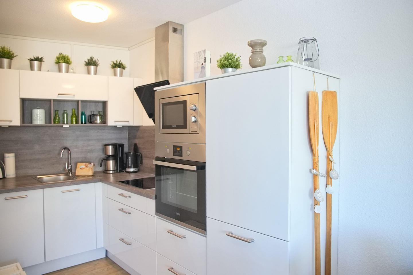 Die offene Küche ist vollständig ausgestattet und lässt keine Wünsche offen. Sie finden einen Cerankochfeldherd, einen Backofen, eine Mikrowelle sowie eine Spülmaschine vor, die Ihnen das Kochen erleichtern. Auch eine Kaffeemaschine, ein Toaster und ein Wasserkocher sind vorhanden. Neben den modernen Küchengeräten stehen Ihnen auch ausreichend Küchenutensilien zur Verfügung, um Ihre Lieblingsgerichte zuzubereiten.