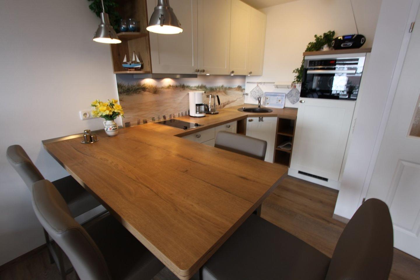 Die offene Einbauküche verfügt über ein 2- Platten- Cerankochfeld, Backofen, Mikrowelle, Geschirrspüler, Kühlschrank mit Gefrierfach, Kaffeemaschine, Wasserkocher und Toaster.