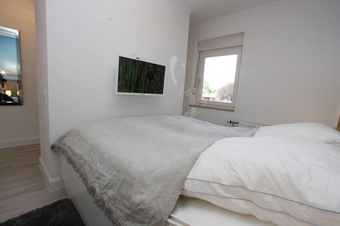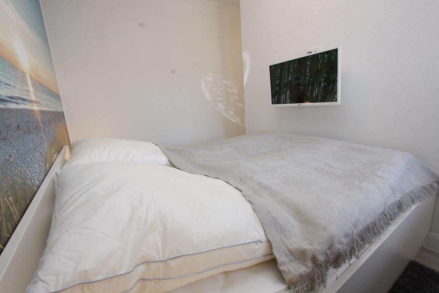 Zurück auf den Flur kommen Sie in das Schlafzimmer mit einem Doppelbett ( 2x90x200) und einem Fernseher. Das Schlafzimmer ist durch zwei Durchgänge ( keine Türen ) zu begehen. Das Fenster lässt sich durch einen Außenrollladen komplett verdunkeln.