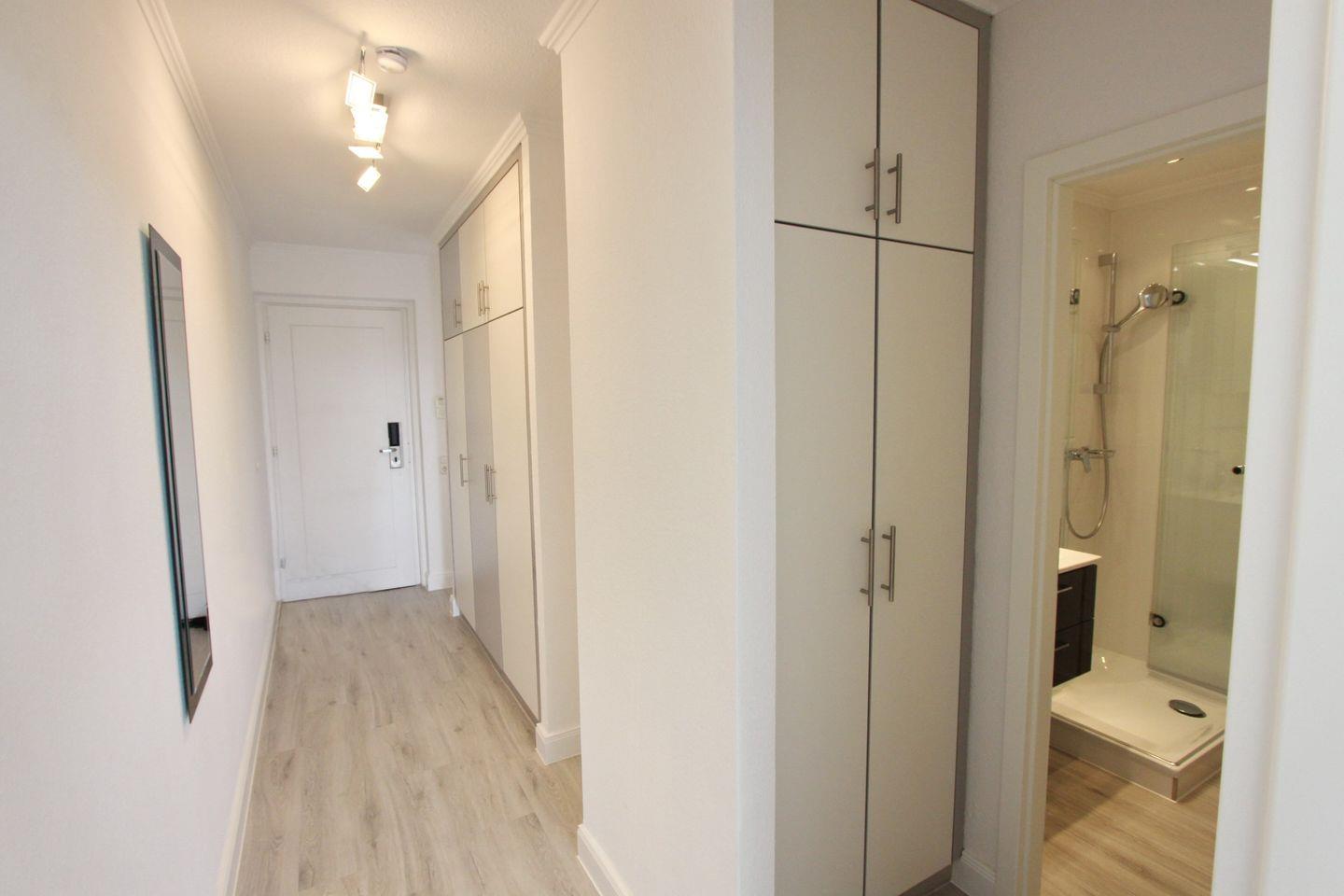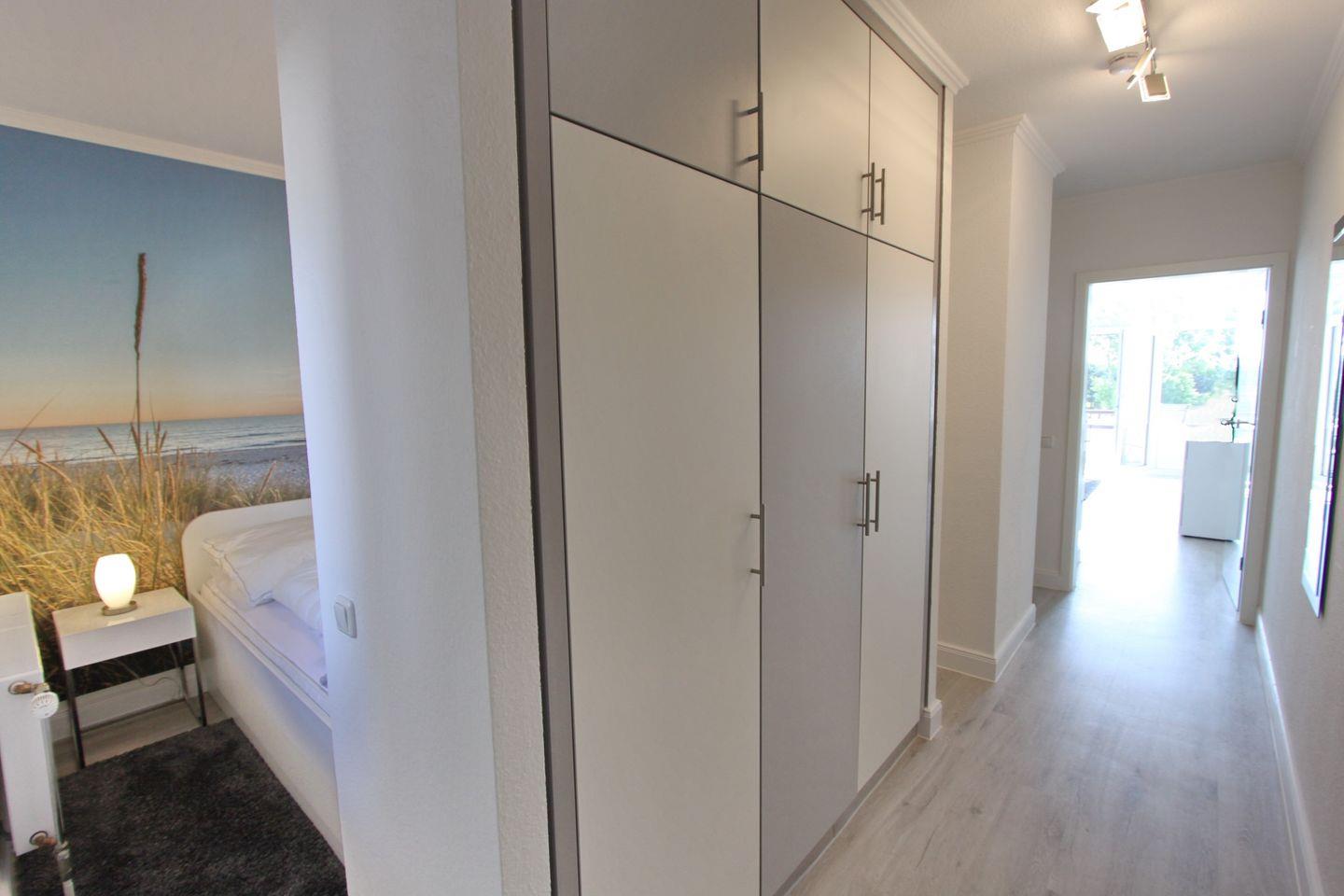 Der schmale Flur mit großem Einbauschrank und Spiegel begleitet Sie geradeaus in den Wohn- und Kochbereich.