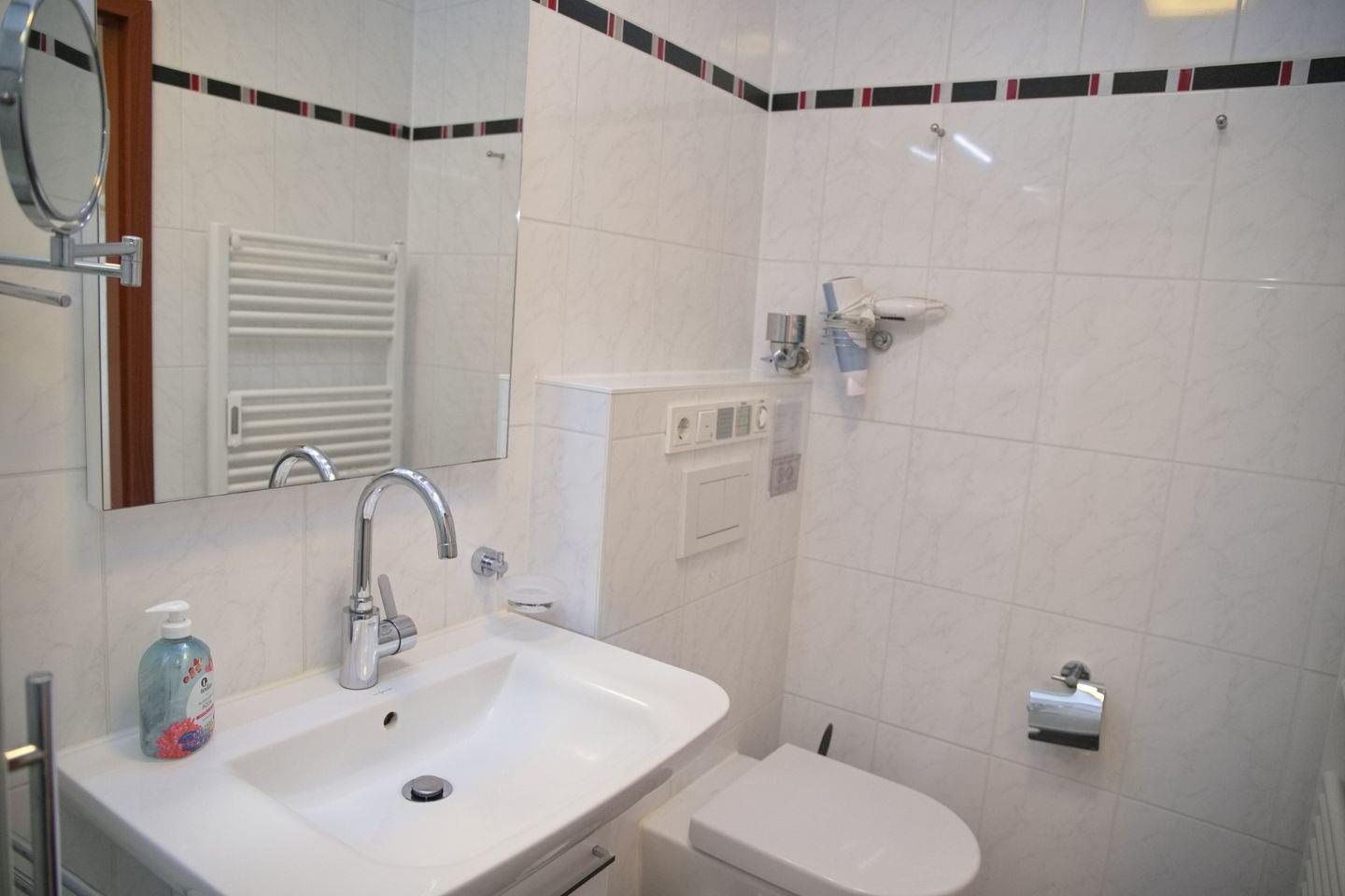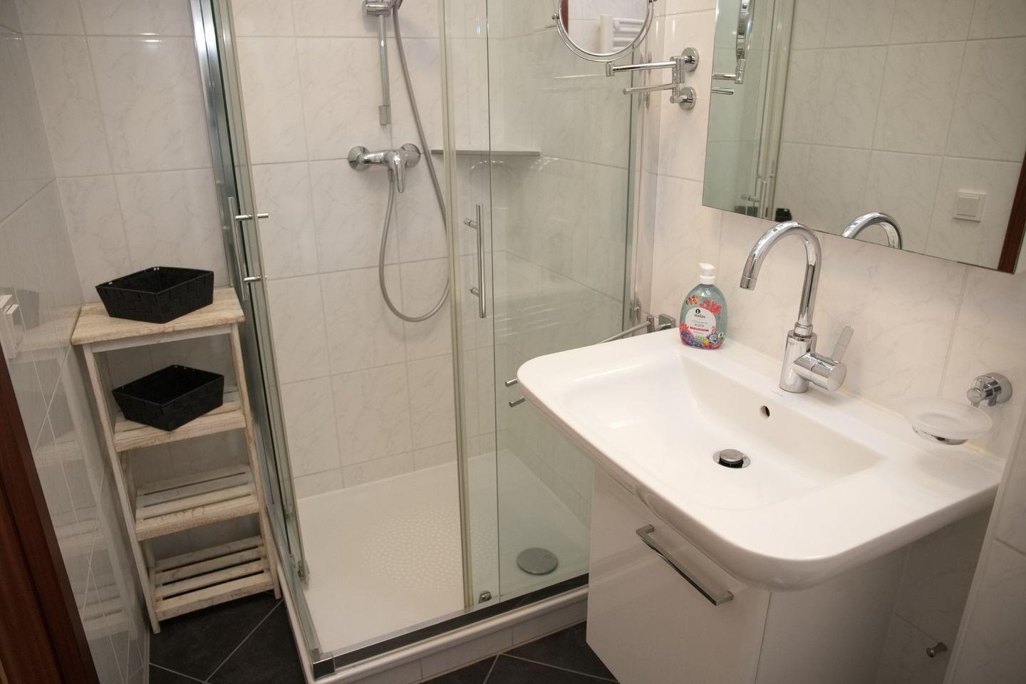Das moderne, helle Bad ist mit Echtglasduschkabine, Waschbecken mit Unterschrank, Kosmetikspiegel und integriertem Radio ausgestattet.
