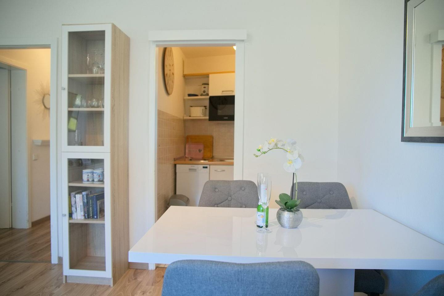 Die angrenzende Küche ist ausgestattet mit einem Cerankochfeld, Backofen, Geschirrspüler, Kühlschrank mit Gefrierfach, Mikrowelle, Wasserkocher, Toaster und Kaffeemaschine.