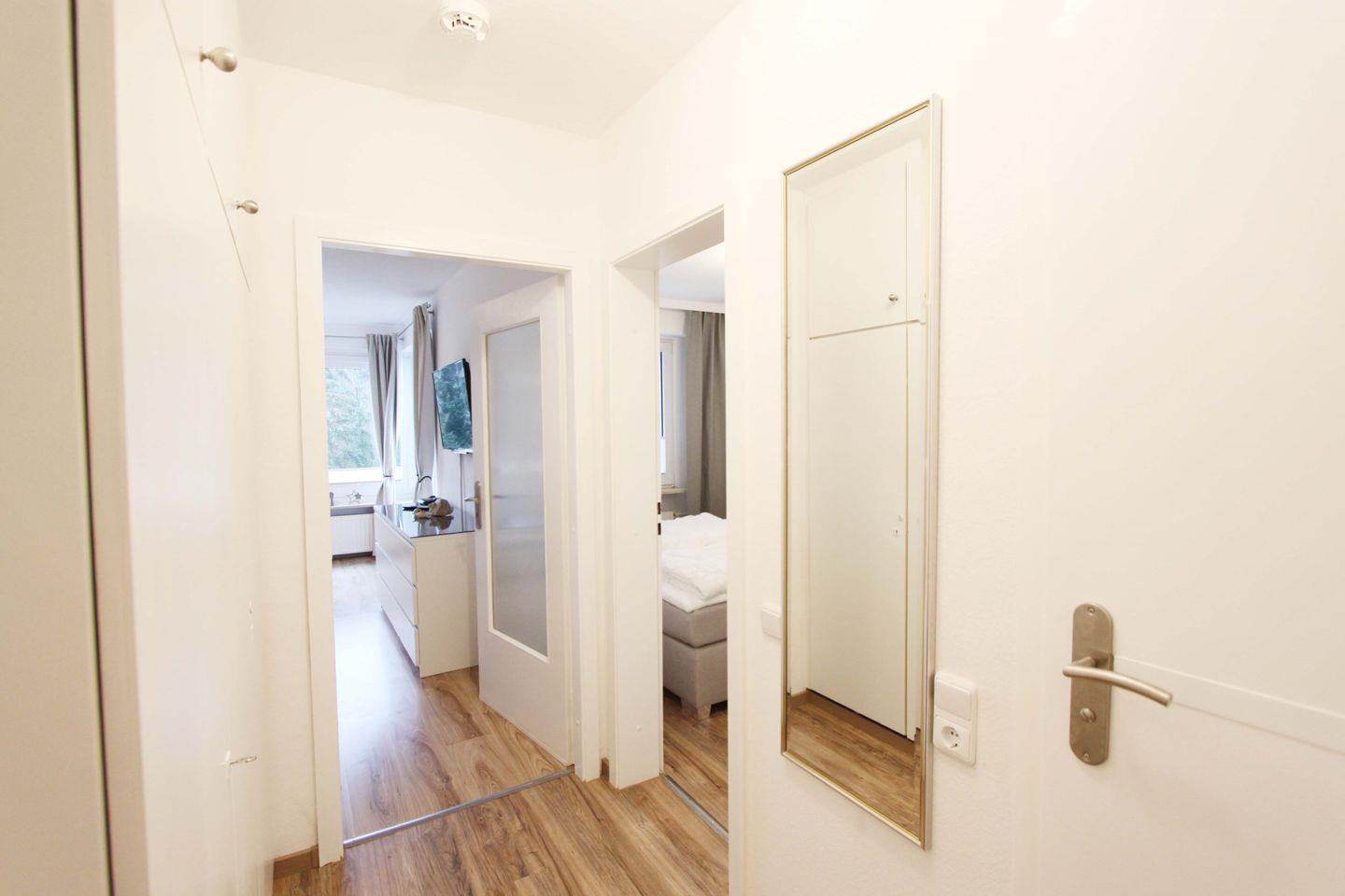 Dort angekommen, erwartet Sie eine helle und moderne Ferienwohnung. Über den Flur erreichen Sie alle Räume. Ein Einbauschrank hält viel Stauraum bereit.