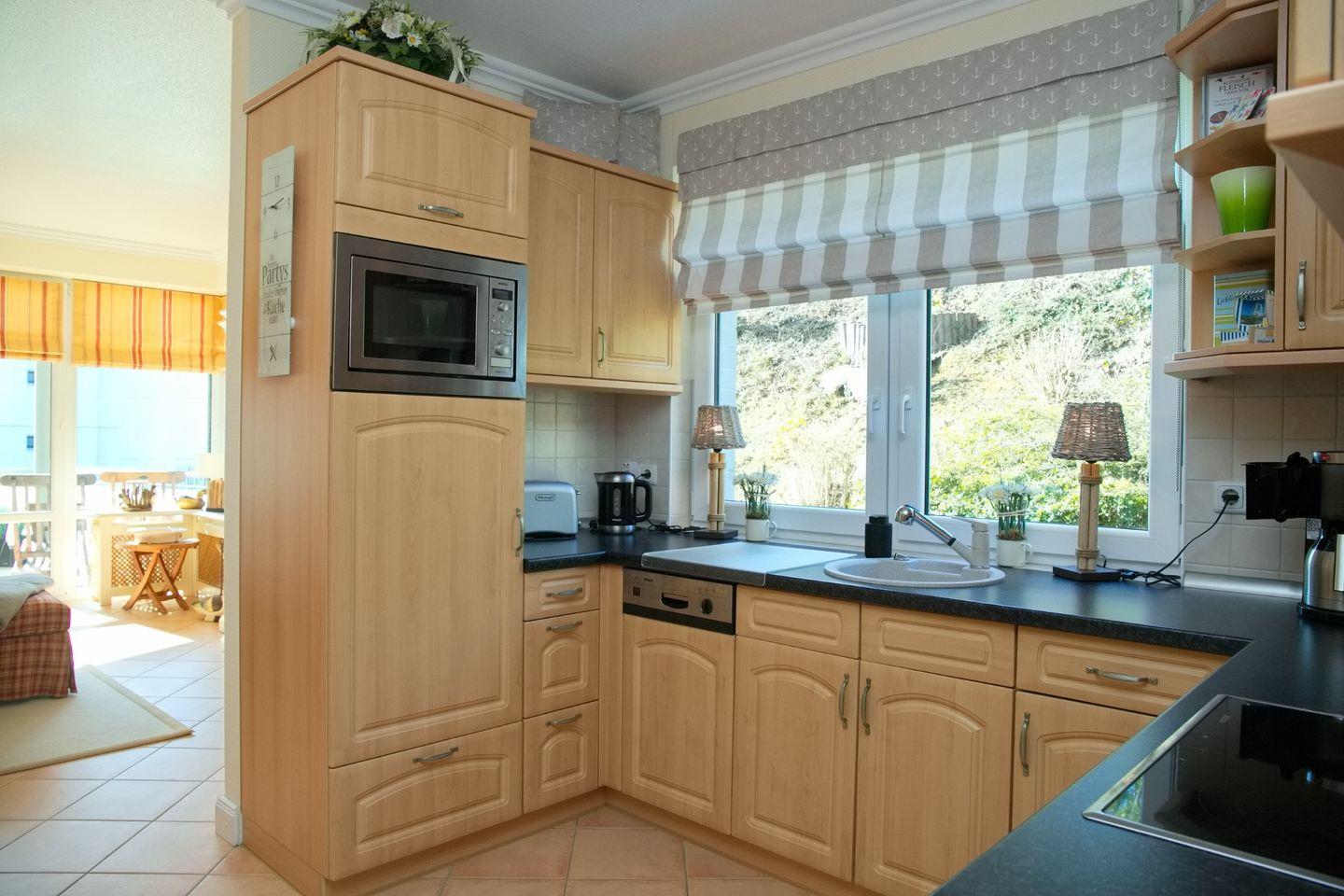 Die offene Küche hat ein Cerankochfeld, ein Backofen, ein Geschirrspüler, einen Kühlschrank mit Gefrierfach, einen Wasserkocher, einen Toaster, eine Kaffeemaschine und eine Mikrowelle