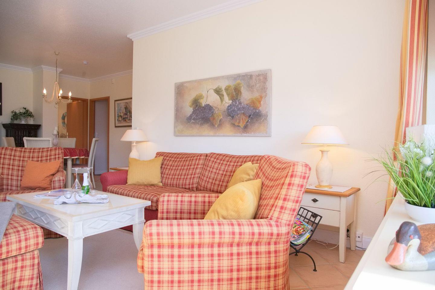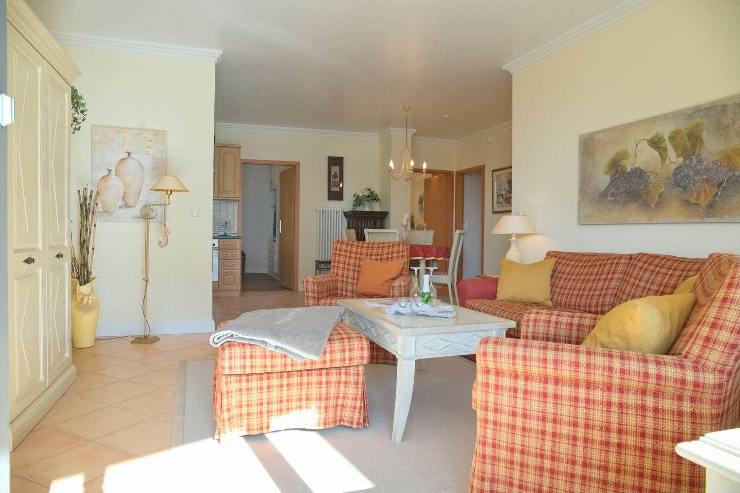 Das Wohnzimmer bietet Ihnen 1 Sofa, 2 Sessel, den Zugang zum Balkon, ein großer Flach TV, einen DVD- Player und eine Stereoanlage.
