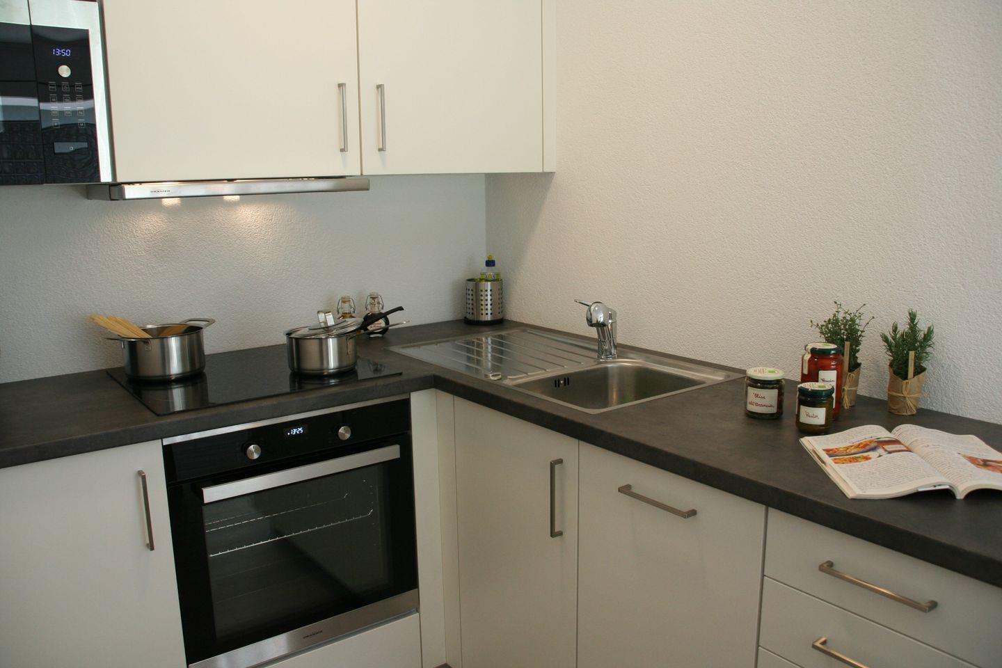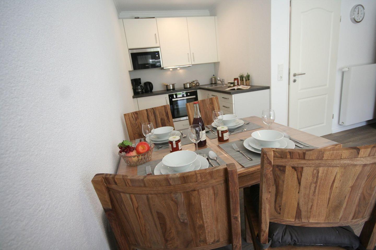 Die offene Einbauküche verfügt über ein 4 Platten Cerankochfeld, Dunstabzugshaube, Mikrowelle, Backofen, Kühlschrank mit 3* Gefrierfach, Geschirrspülmaschine, Kaffeemaschine, Wasserkocher und Toaster. Vom Wohnbereich gelangen Sie auf die möblierte, teilweise überdachte Terrasse in Westlage.
