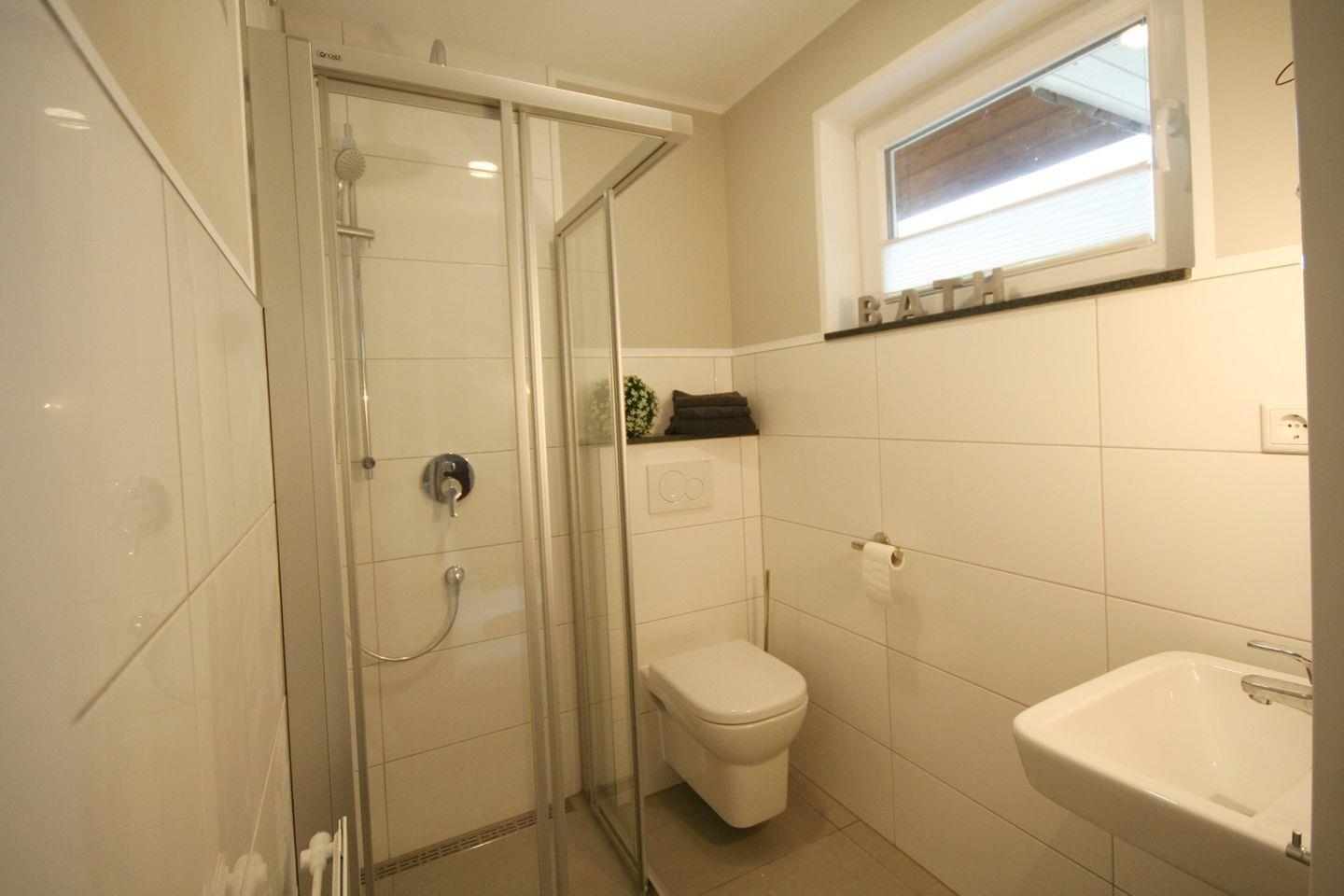 Das Duschbad verfügt über ein Außenfenster und Plissee.