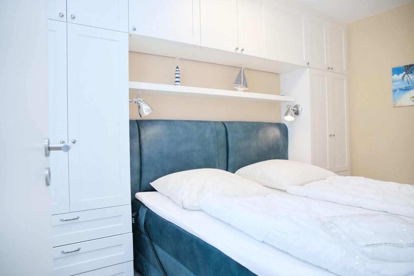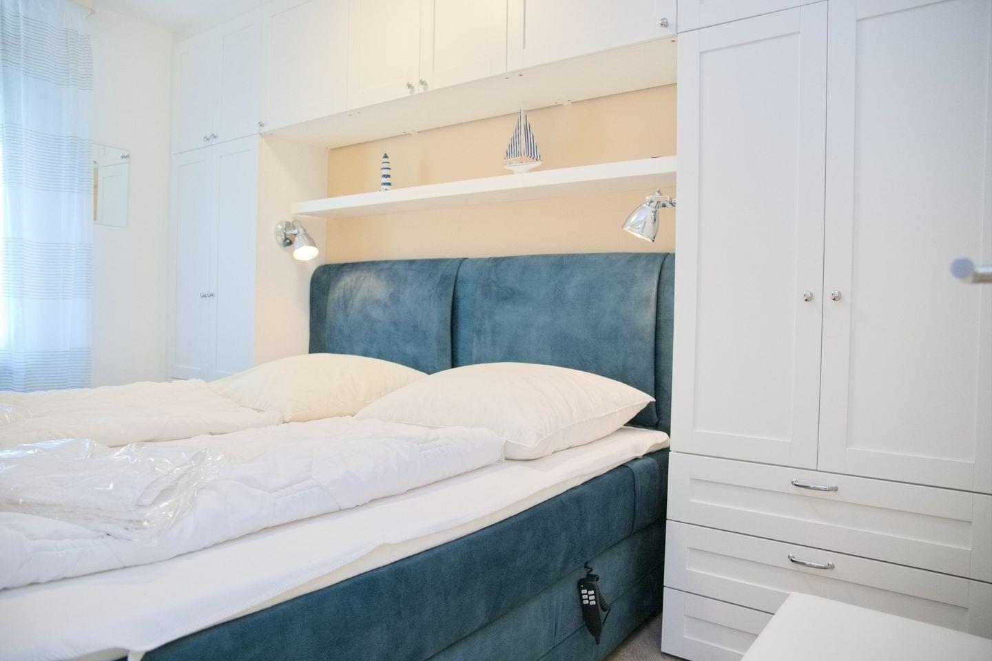 Das Schlafzimmer beeindruckt mit einem luxuriösen Boxspringbett (elektrisch verstellbar, Topper, 180x200 cm) und einrahmende geräumige Kleiderschränke, um Ihre Urlaubsgarderobe ordentlich zu verstauen sowie einem weiteren Smart-TV. Das Kinderzimmer bietet Platz für die Kleinen mit einem Kojenbett (90x200 cm), das zu einem Doppelbett umfunktioniert werden kann, sowie einem weiteren Kleiderschrank.