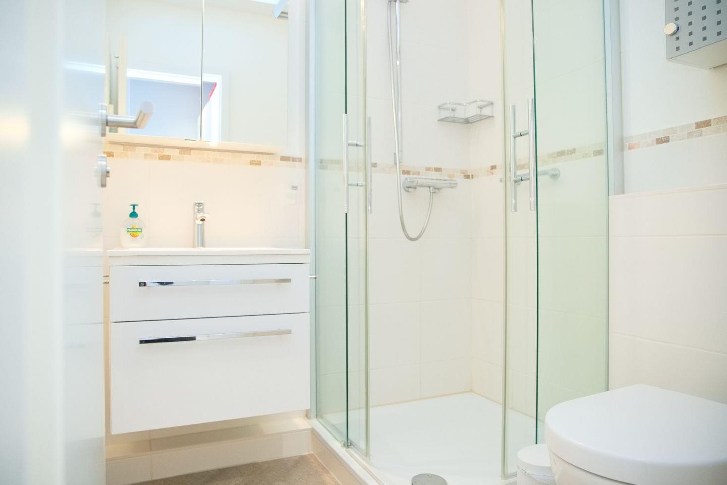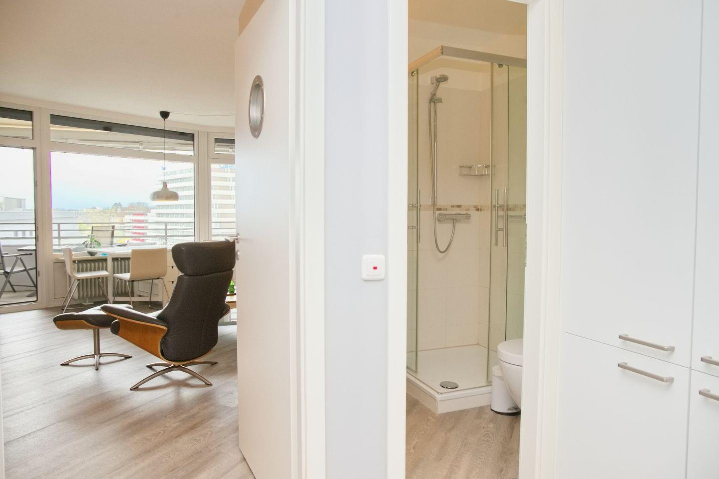Das moderne Bad ist mit einer Dusche, einem WC, einer Handtuchheizung und einem Waschtisch mit Spiegelschrank ausgestattet, um Ihnen einen angenehmen Start in den Tag zu ermöglichen.