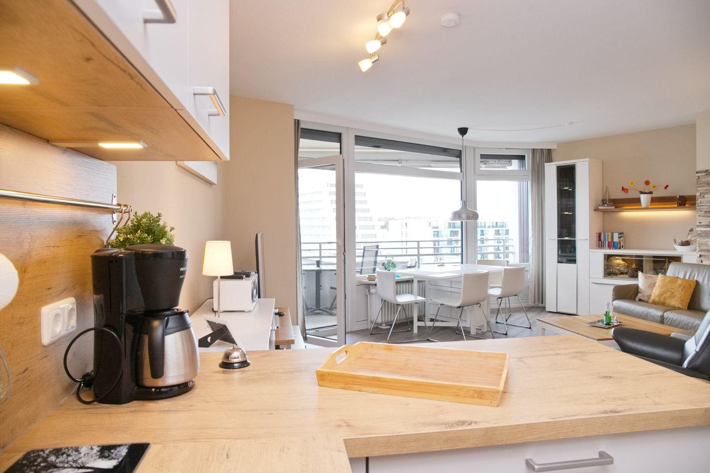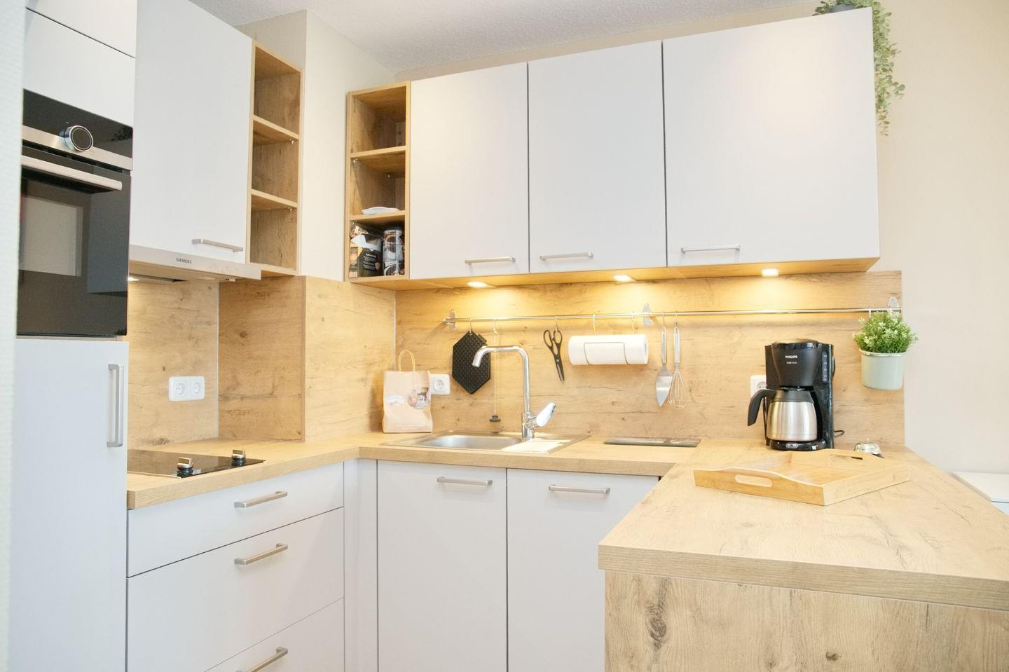 Die vollausgestattete Küche lässt keine Wünsche offen und verfügt über ein 2er Ceranfeld, eine Mikrowelle mit Backofenfunktionen, einem komfortablen Kühlschrank mit Gefrierfach, eine Spülmaschine mit Expressfunktion, einen Toaster, eine Kaffeemaschine und einen Wasserkocher - ideal für die Zubereitung Ihrer Lieblingsgerichte.