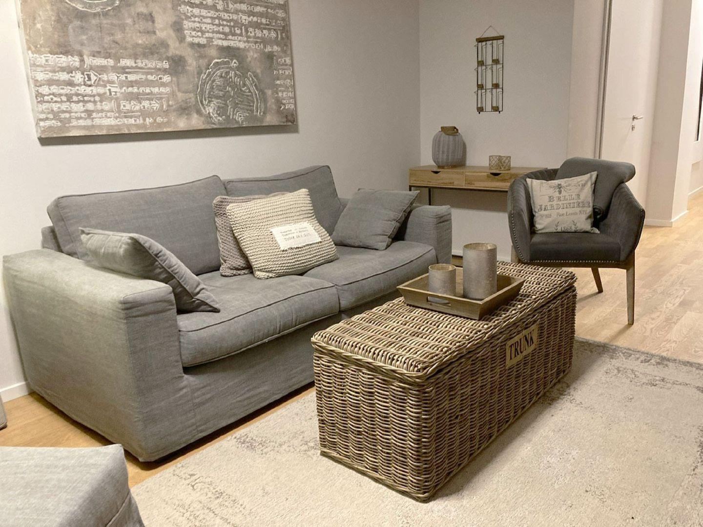 Ihr Wohnbereich ist loungig, cool und gemütlich zugleich. Auf Ihrer stylishen Sofainsel lässt es sich herrlich lümmeln und relaxen. Die technische Ausstattung des Appartements am Strand ist ebenfalls sehr überzeugend: WLAN und insgesamt 3 Flat-TVs (Wohnzimmer sowie jedes Schlafzimmer) verstehen sich von selbst. Ihre Küche hält neben einem Geschirrspüler, Kochfeld, Kühlschrank mit Gefrierfach auch einen Backofen parat.