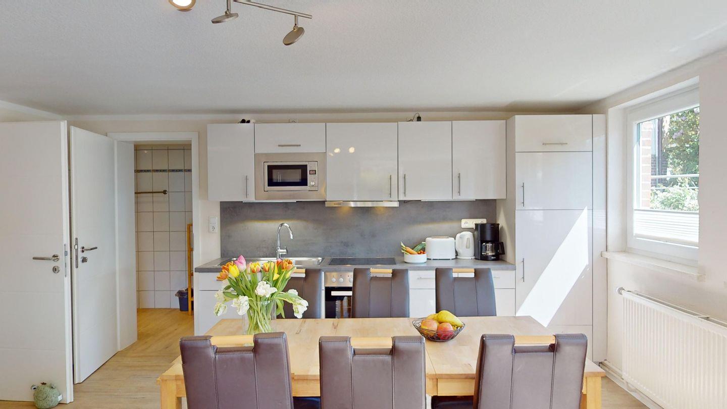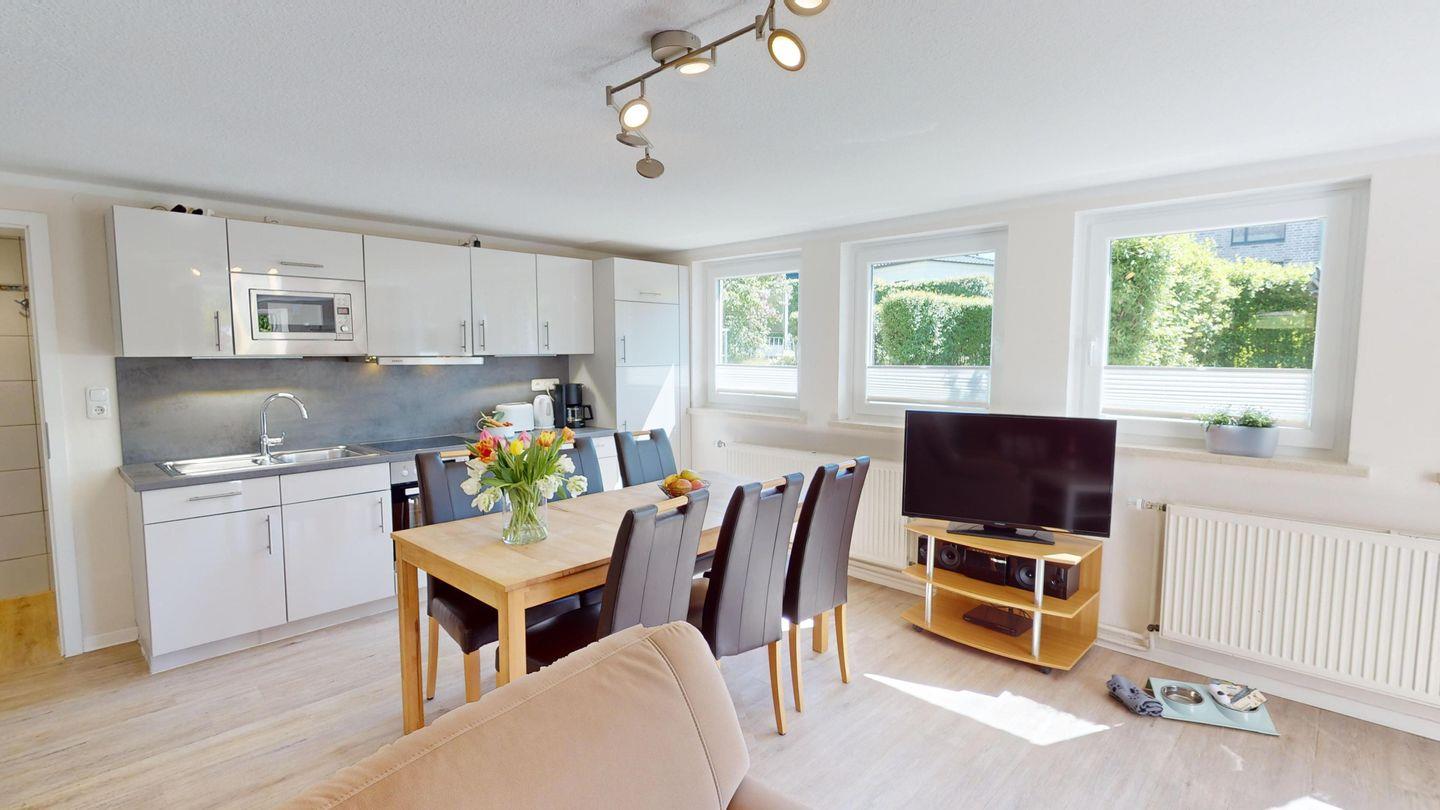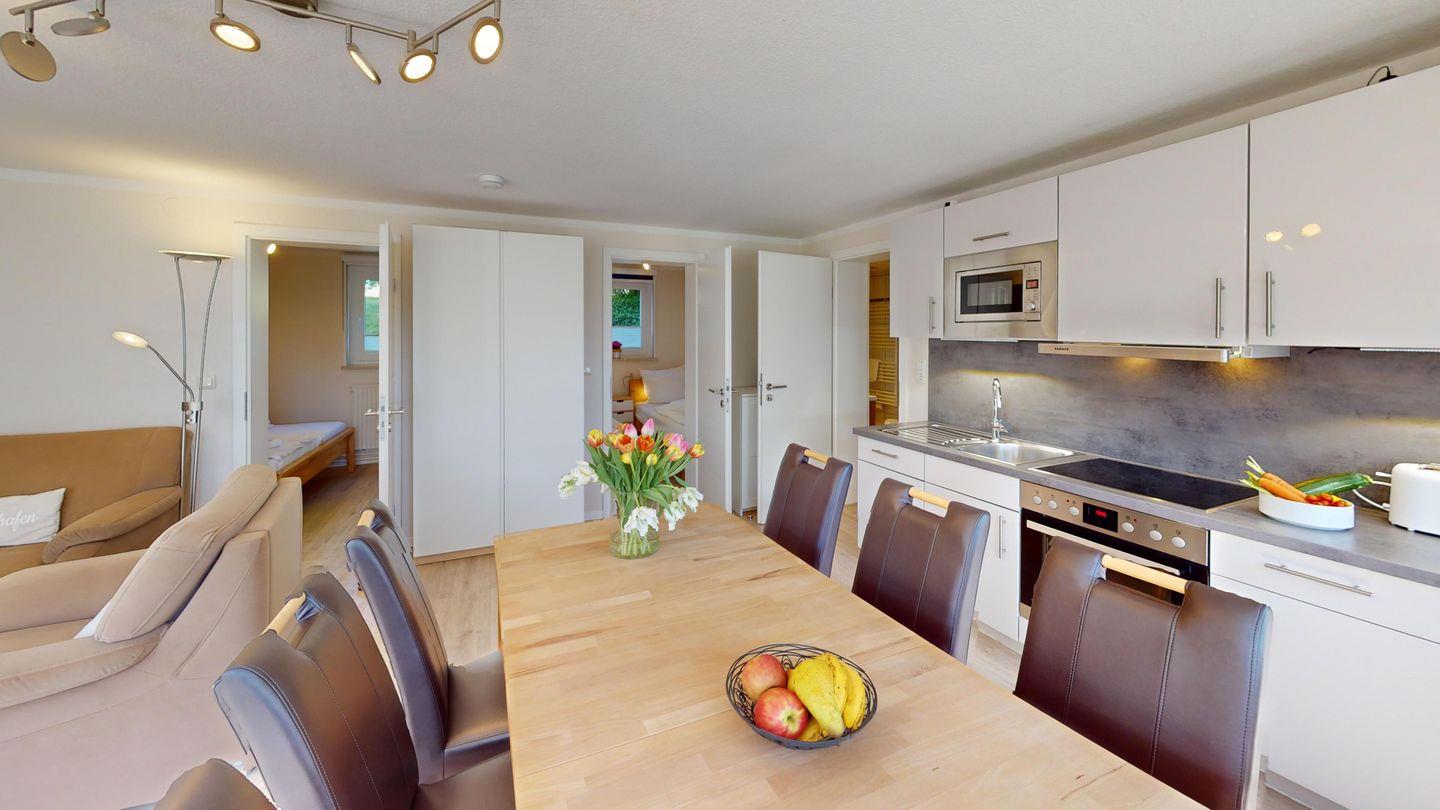 Die Wohnung verfügt über zwei Schlafzimmer, eins mit einem Doppelbett, das andere mit zwei Einzelbetten, ein Badezimmer mit Dusche, eine offene, gut ausgestattete Küchenzeile und einen gemütlichen Wohn-/ Essbereich (Wohn- und Schlafzimmer haben richtige Fenster). Auf Wunsch stellen wir Ihnen gerne kostenfrei ein Kinderbett und einen Hochstuhl zur Verfügung.