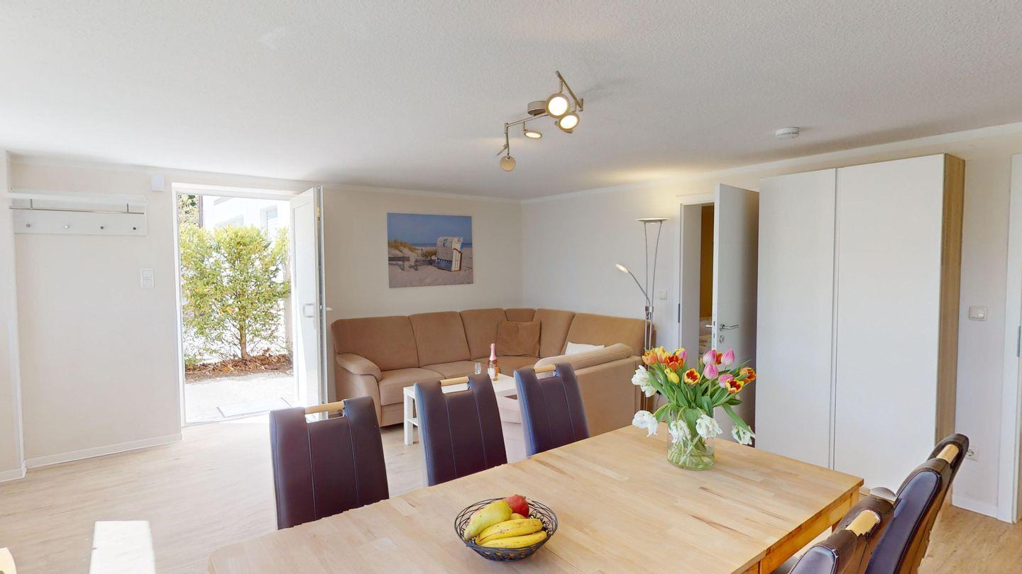 Diese strandnahe 55 m²-Ferienwohnung befindet sich ebenerdig im Halbsouterrain und ist für einen Urlaub mit bis zu vier Personen geeignet. Privates Parken direkt am Haus.