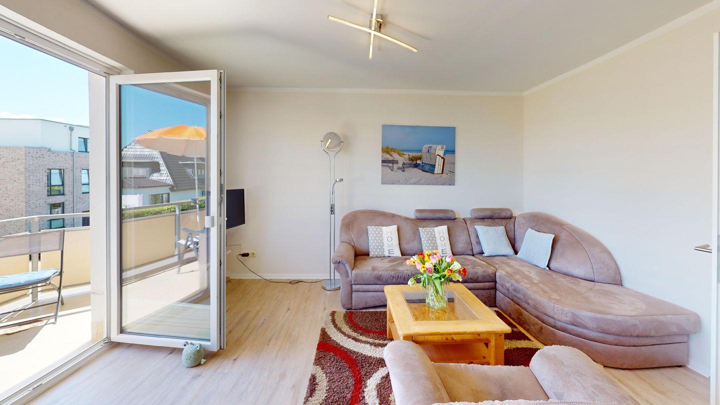 Die Wohnung verfügt über ein Schlafzimmer mit Doppelbett, ein helles Badezimmer mit Dusche, eine gut ausgestattete Küchenzeile und einen Wohn-/ Essbereich. Auf Wunsch stellen wir Ihnen gerne kostenfrei ein Kinderbett und einen Hochstuhl zur Verfügung. Das Highlight der Wohnung ist der Balkon mit Blick auf die Ostsee.