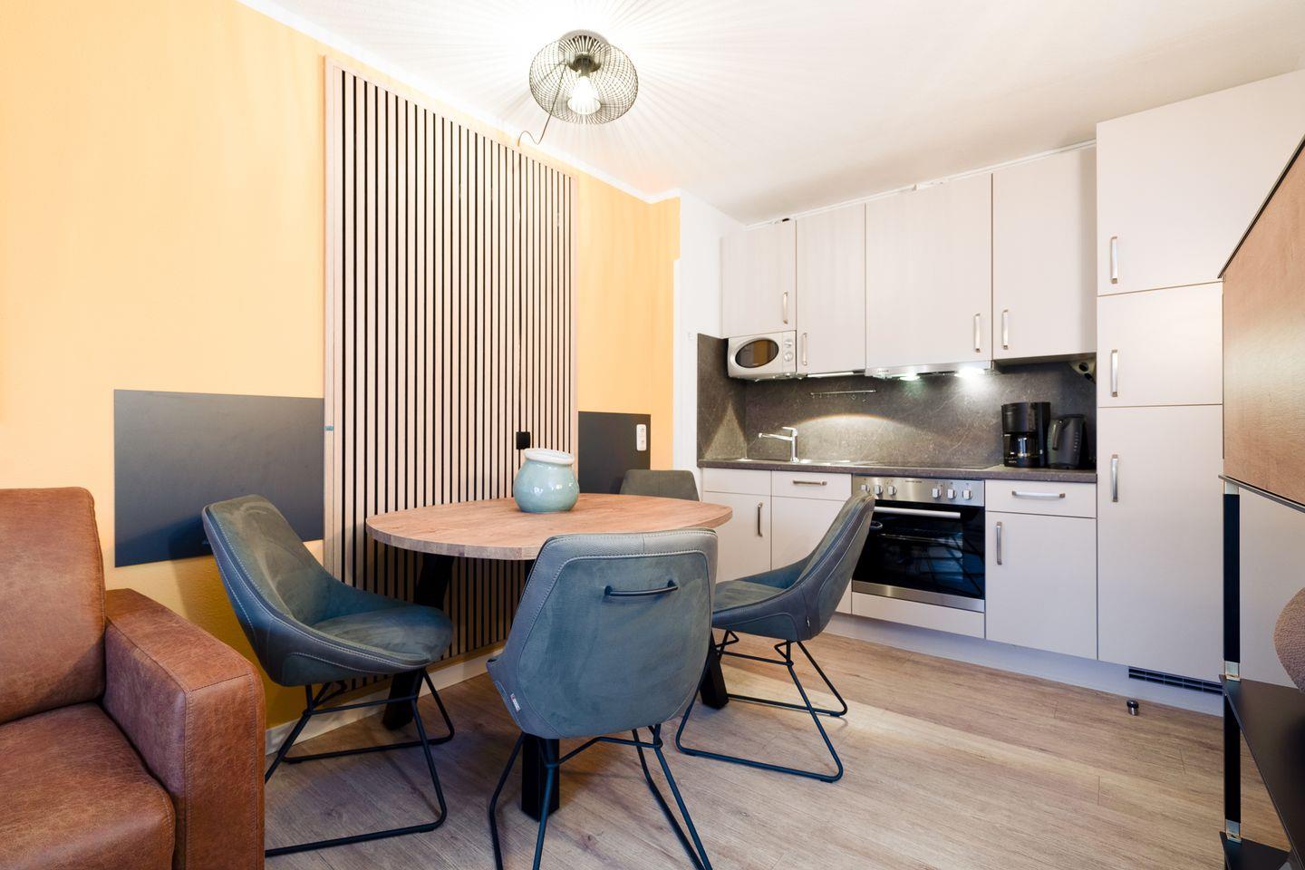 Die Küche ist gut ausgestattet und geht in eine kleine Essecke über, die zum Verweilen und gemeinsamen Kochen einlädt. Der große Balkon mit gemütlichen Möbeln bietet zudem den perfekten Ort zum Entspannen und Genießen der frischen Luft.