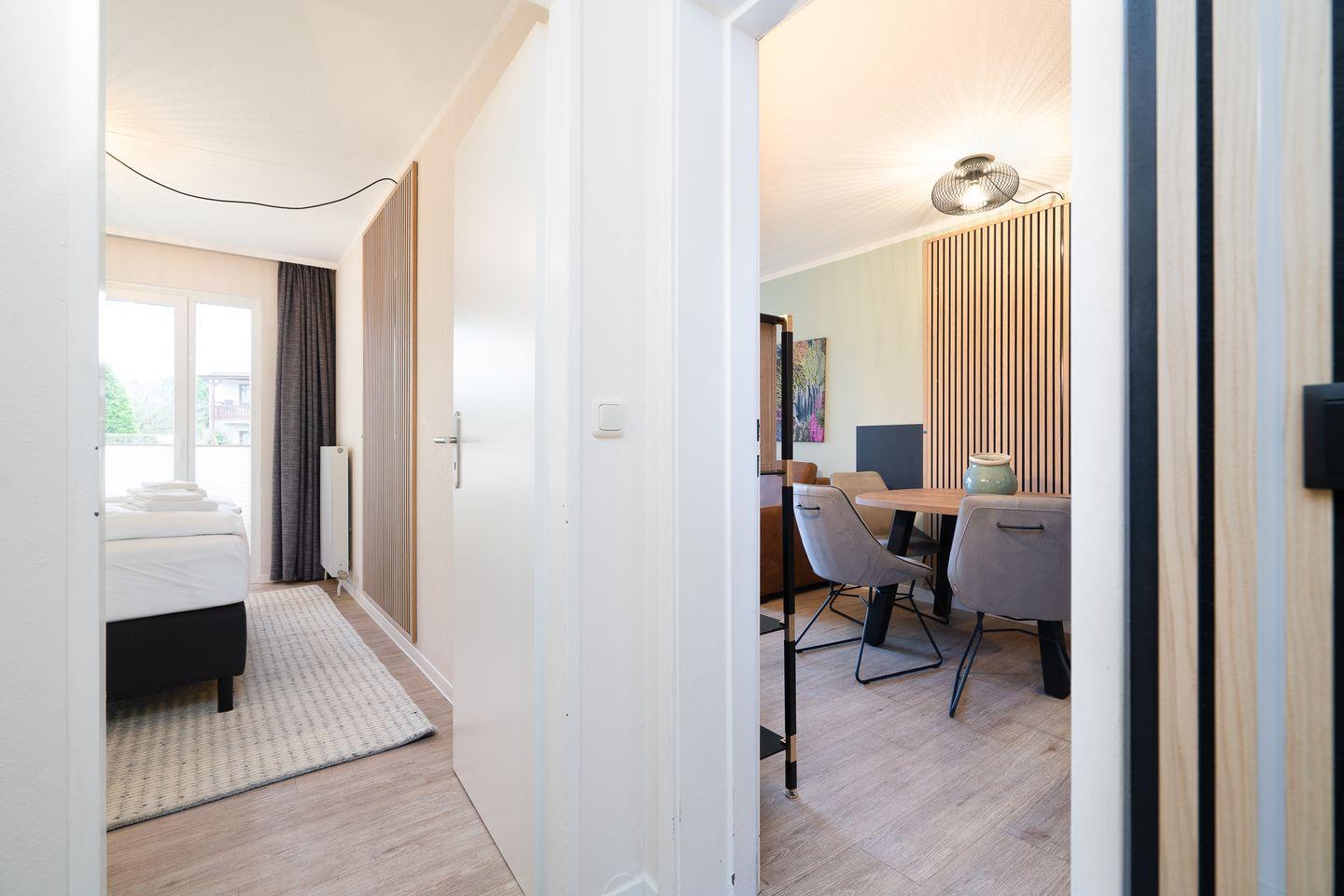 Das gemütliche Schlafzimmer mit einem komfortablen Doppelbett garantiert erholsame Nächte. Im Wohnbereich finden zwei weitere Gäste auf einer hochwertigen Schlafcouch Platz. Beide Räume lassen sich abdunkeln, um Ihnen maximalen Komfort zu bieten. Auf Wunsch stellen wir Ihnen ein Kinderbett und einen Hochstuhl zur Verfügung. Das moderne Badezimmer ist mit einer Dusche ausgestattet und rundet das Wohlfühlambiente ab.