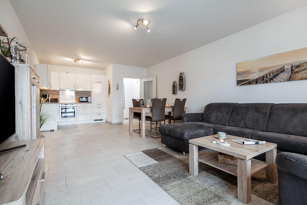 Es erwartet Sie ein großes helles Wohnzimmer mit einer hochwertigem Velourscouch, die sich im handumdrehen zur Schlafcouch umfunktionieren lässet und eine zum Wohnbereich offene, integrierte Küche mit Essbereich.