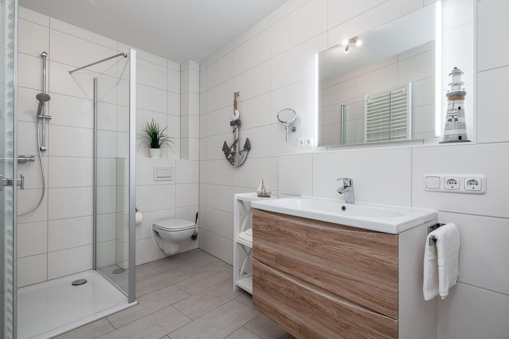 Das moderne Duschbad mit bodentiefer Duschtasse bietet Ihnen genügend Platz für Ihre persönlichen Gegenstände, ein Föhn ist auch vorhanden.