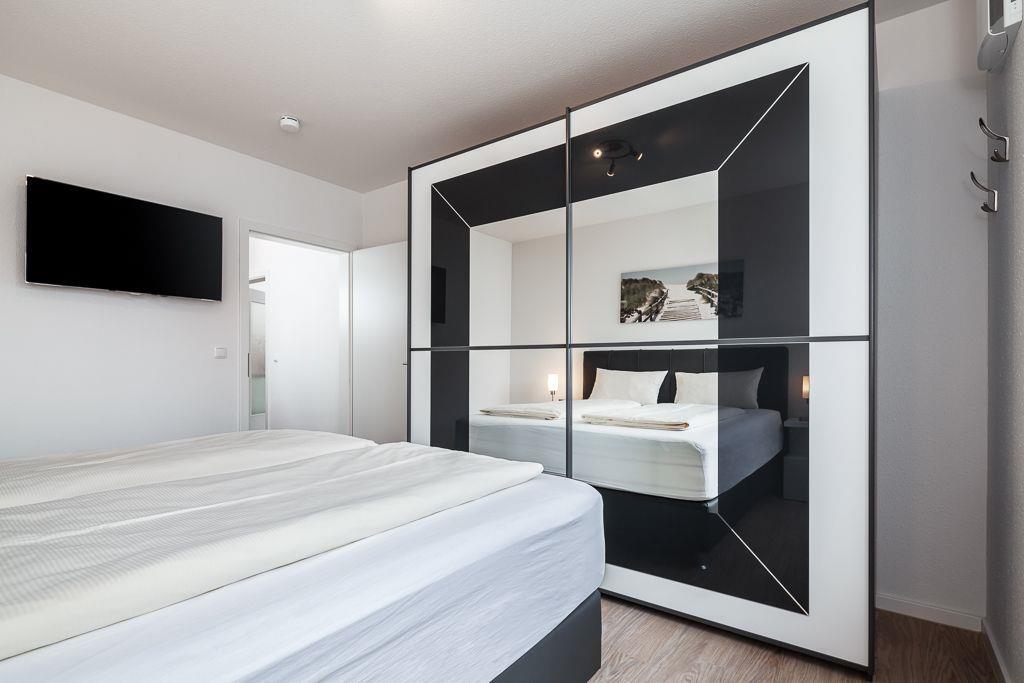 Das Schlafzimmer ist mit einem Boxspringbett (180x 200), einem Kleiderschrank mit Spiegel und einem zusätzlichem Flachbildschirm (40 Zol)l möbliert. Das Schlafzimmerfenster hat ein Fliegengitter und verfügt über elektrische Außenjalousien (alle Fenster inkl. Balkon).