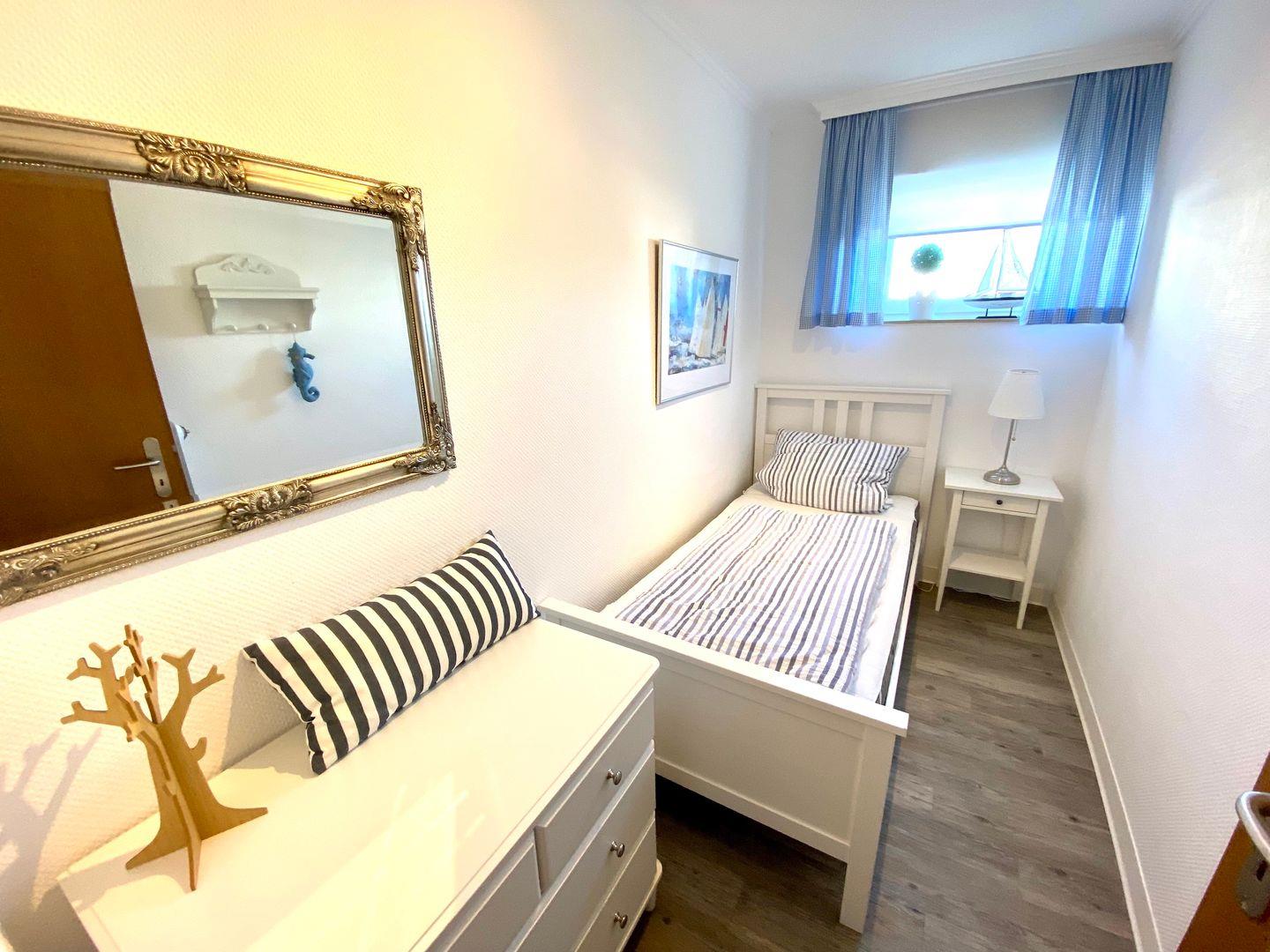 In dem zweiten Schlafzimmer befindet sich ein Einzelbett mit Kommode.