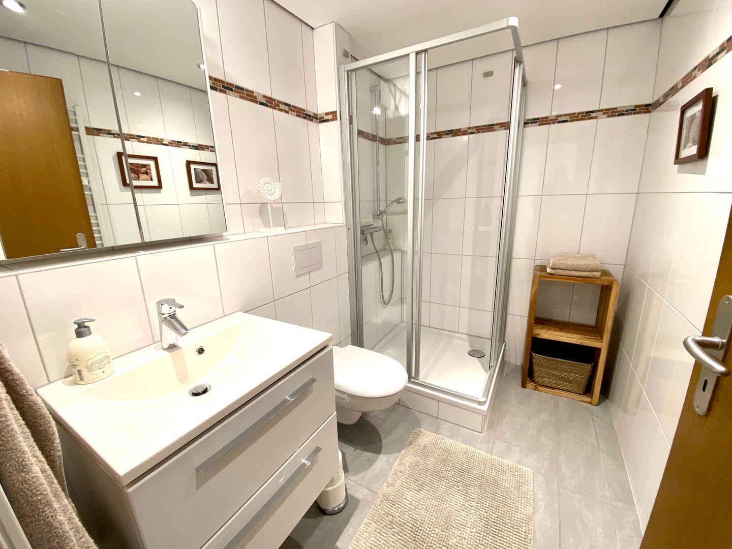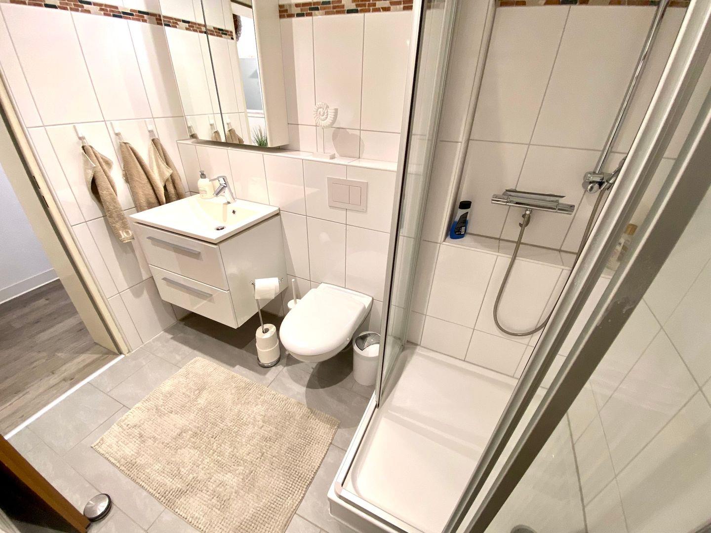 Das Badezimmer verfügt über eine Dusche, WC und Waschtisch.